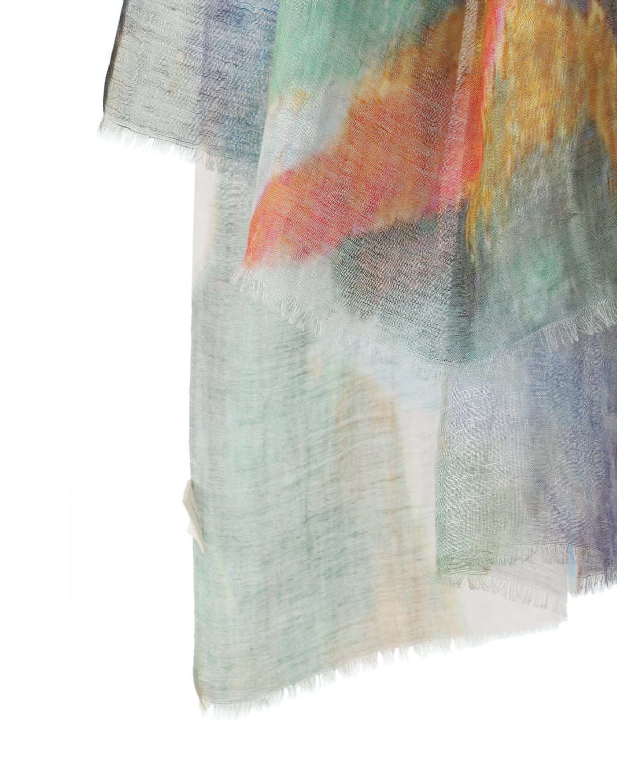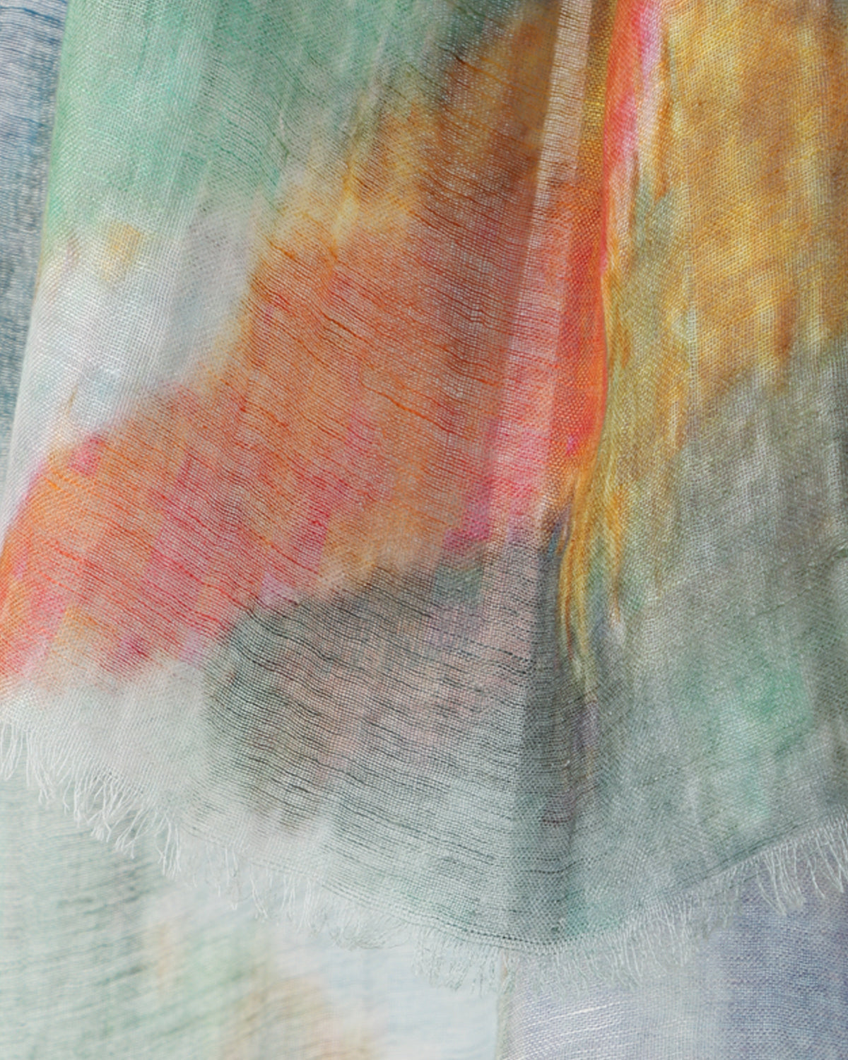 Abstract art inspired scarf with blurry hints of blue, red, green, and yellow hues, crafted from Cotton Linen.