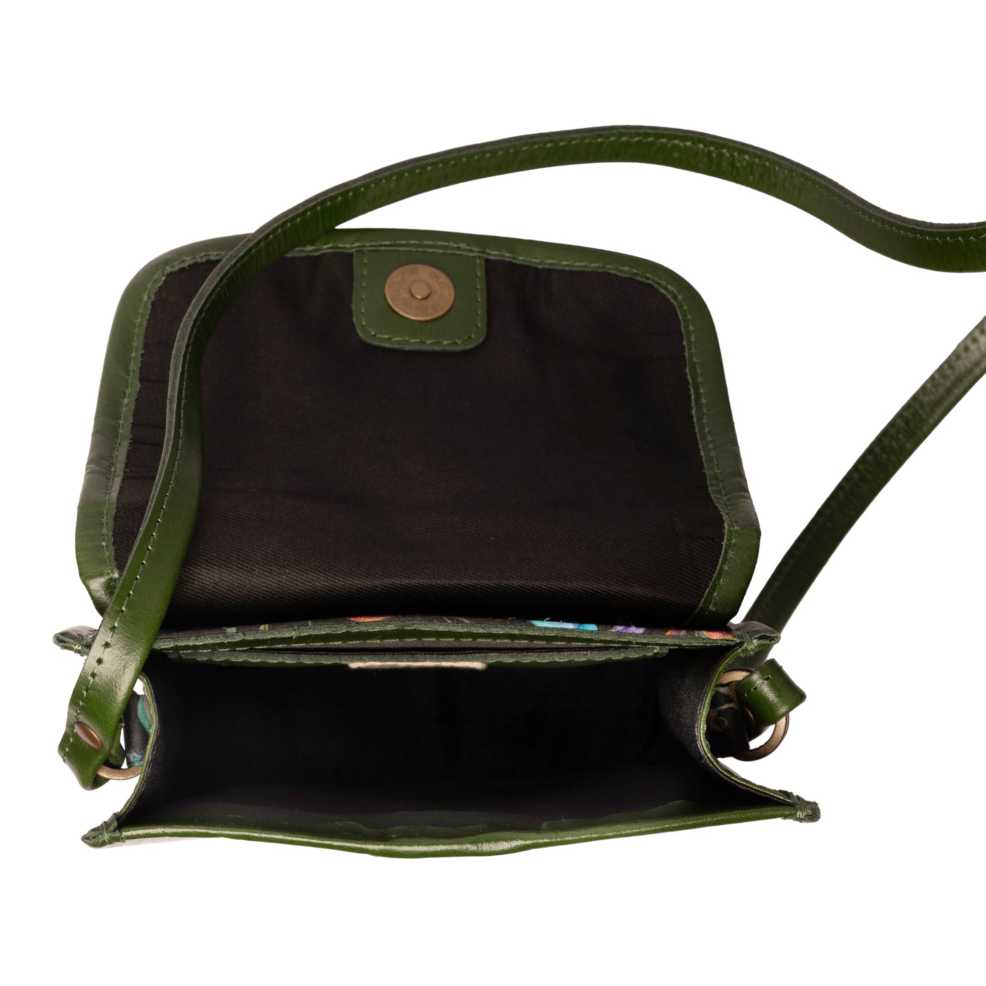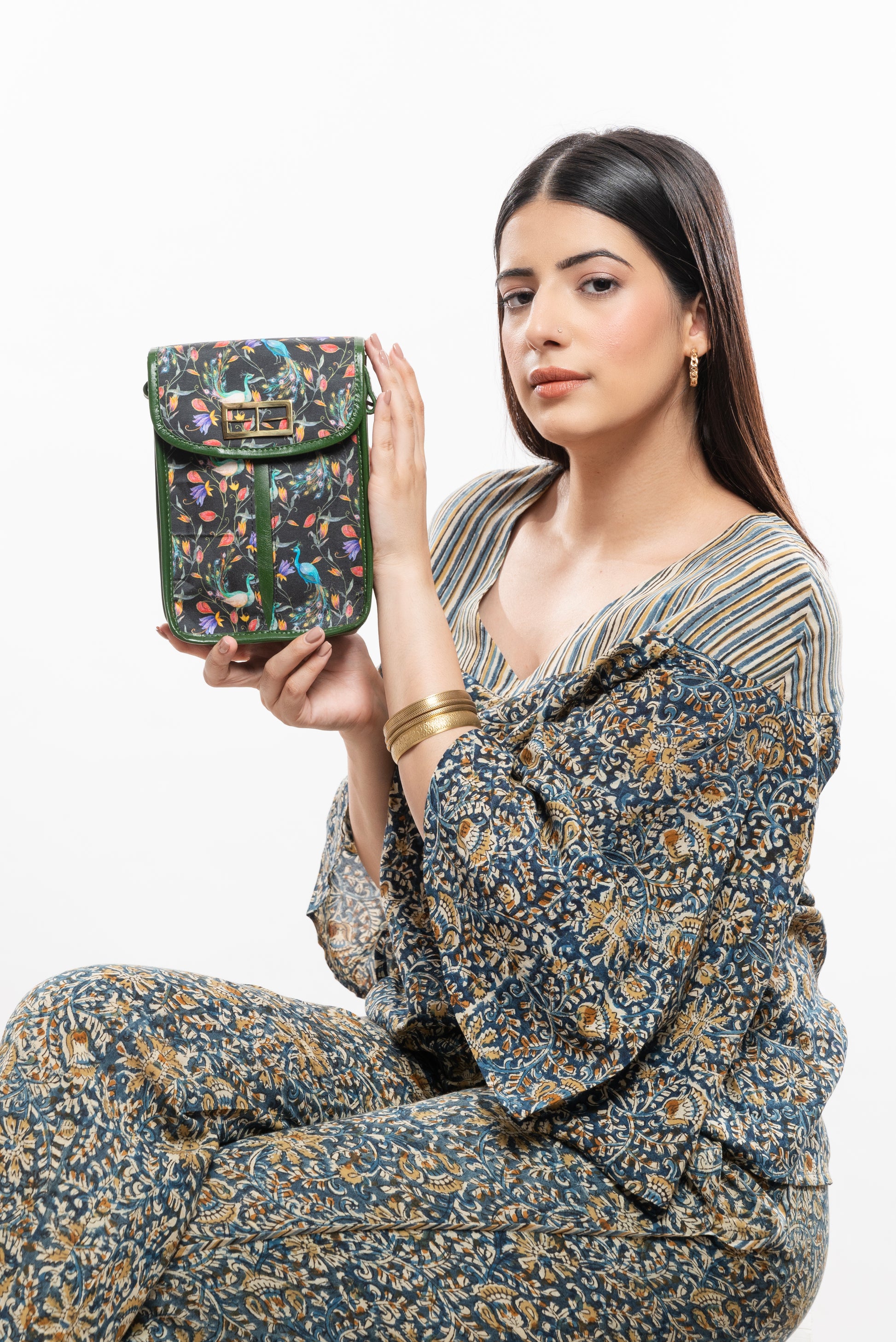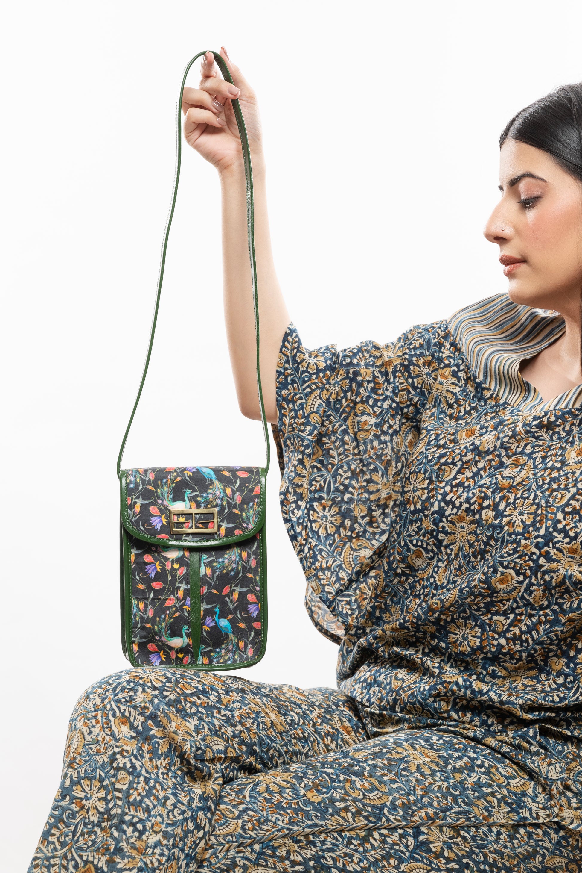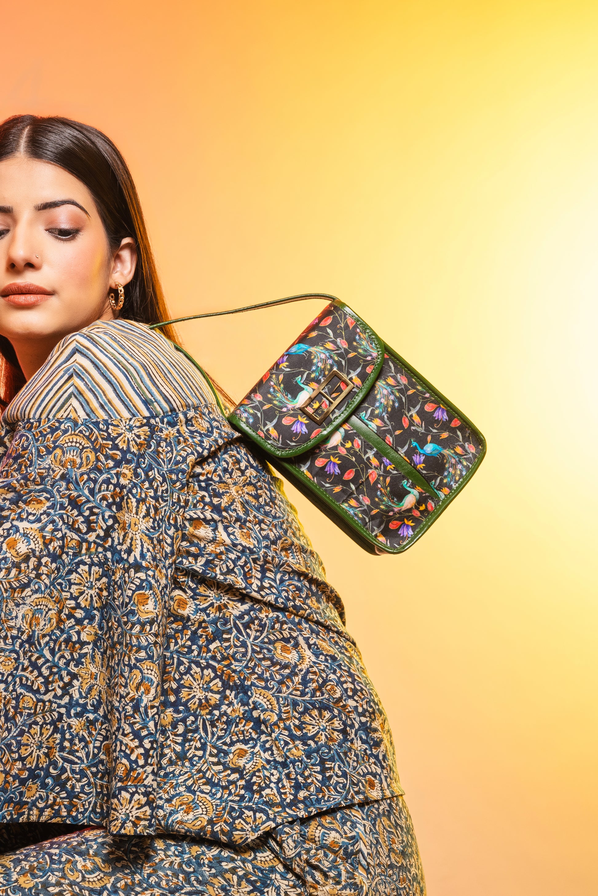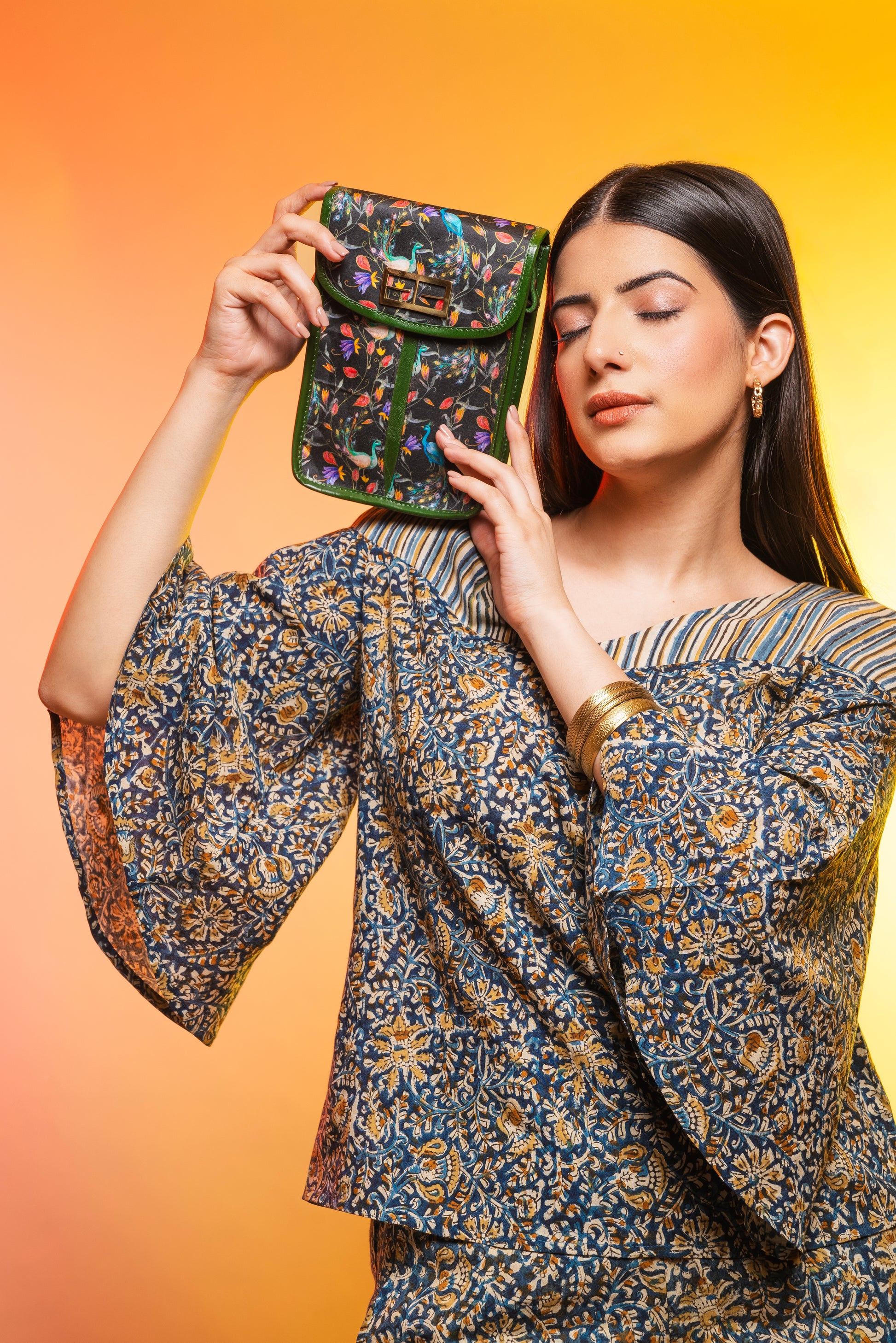 Elevate your style with this exquisite sling bag crafted from luxurious modal silk and adorned with a sophisticated leather trim. The vibrant and intricate pattern is a true showstopper, featuring a blend of colorful flora and fauna, making it a unique addition to any wardrobe.