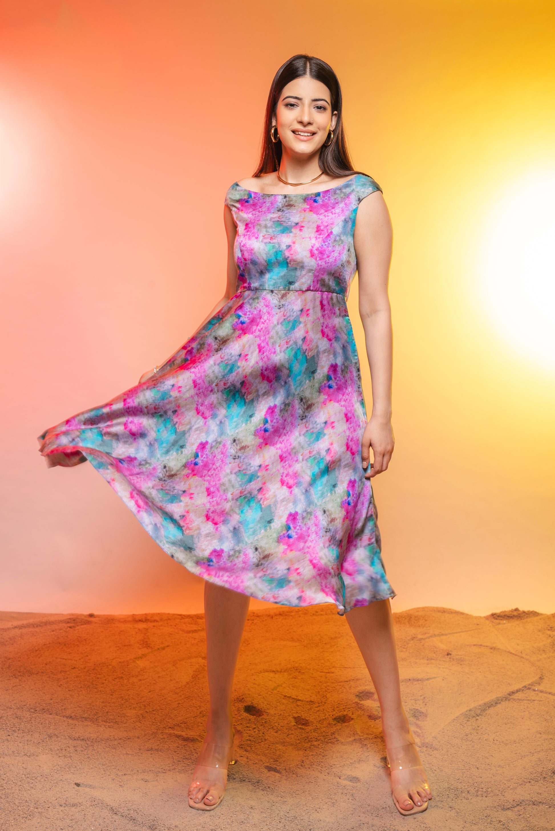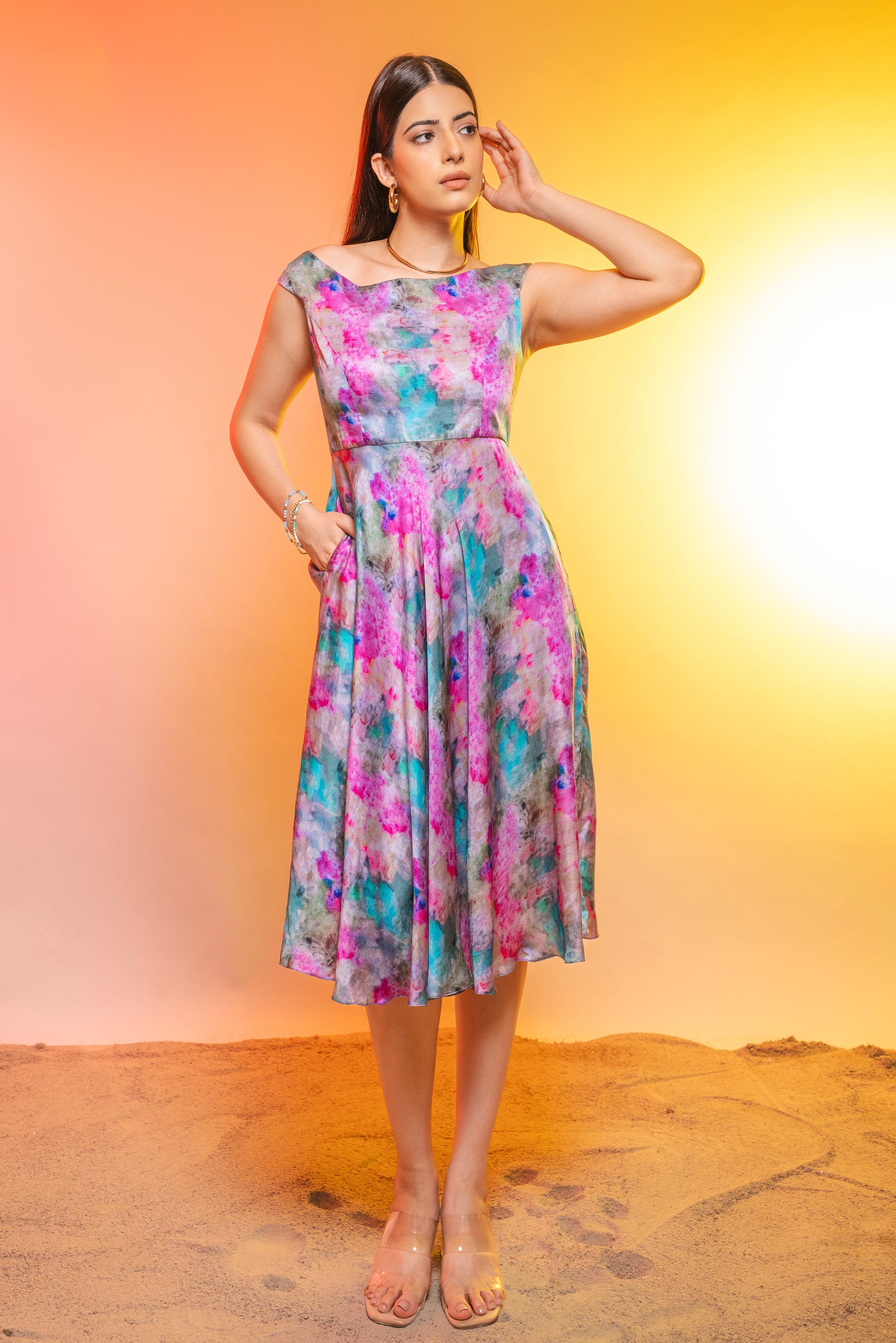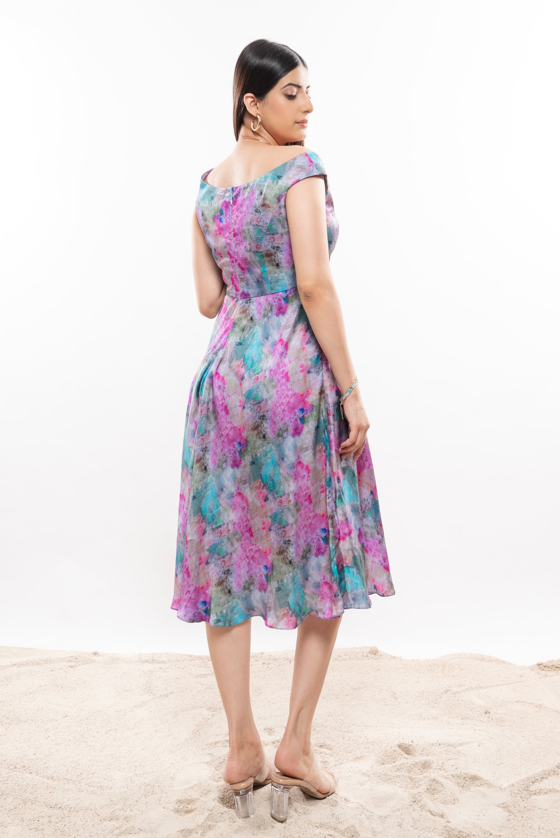 The Aurora Off Shoulder Dress display an elegant off-shoulder neckline with princess cut-and-sew detailing, sleeveless design, and a knee-length flared silhouette. Crafted from opulent modal satin with an abstract print, this comfort-fit dress is both stylish and effortless.