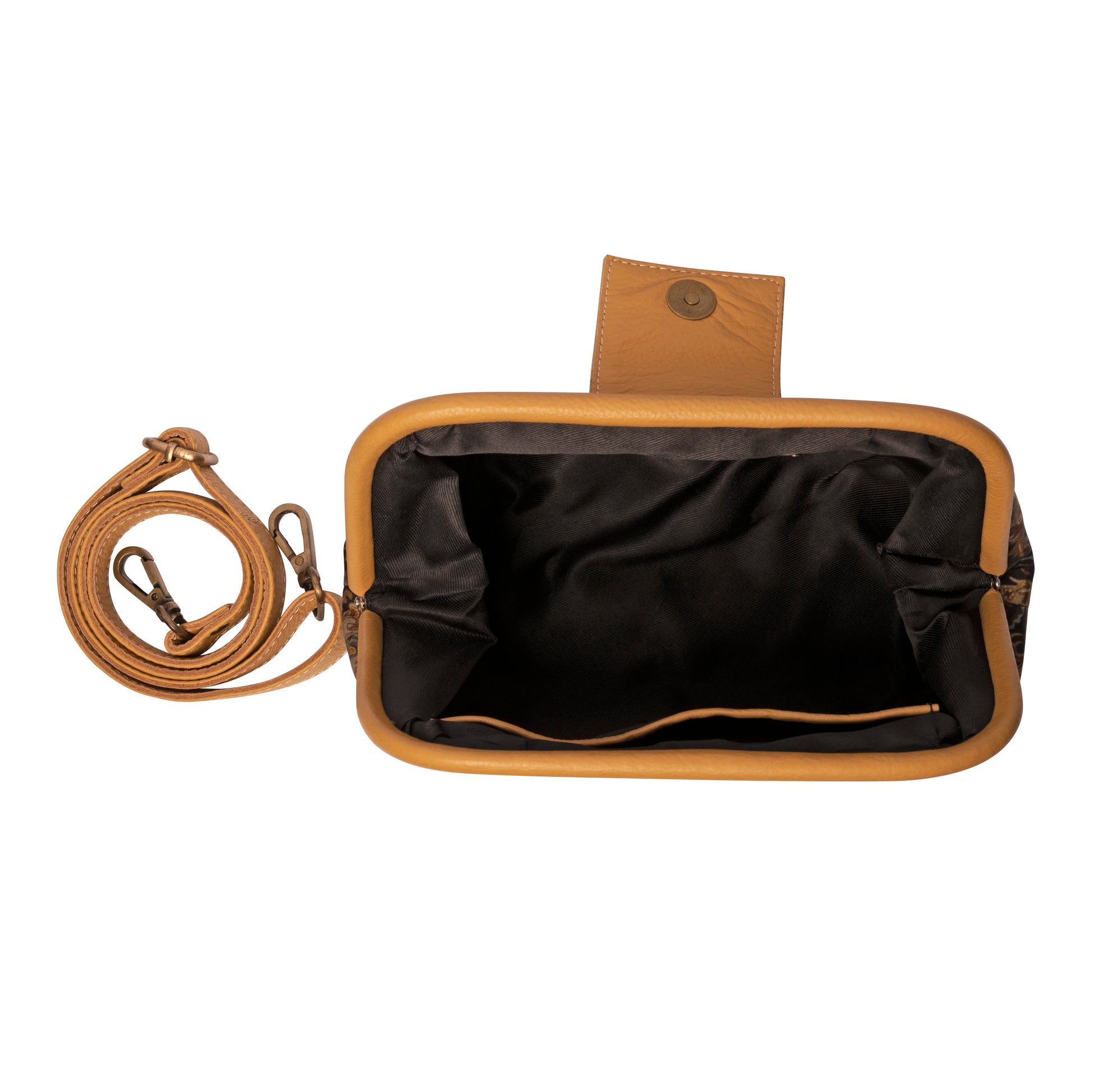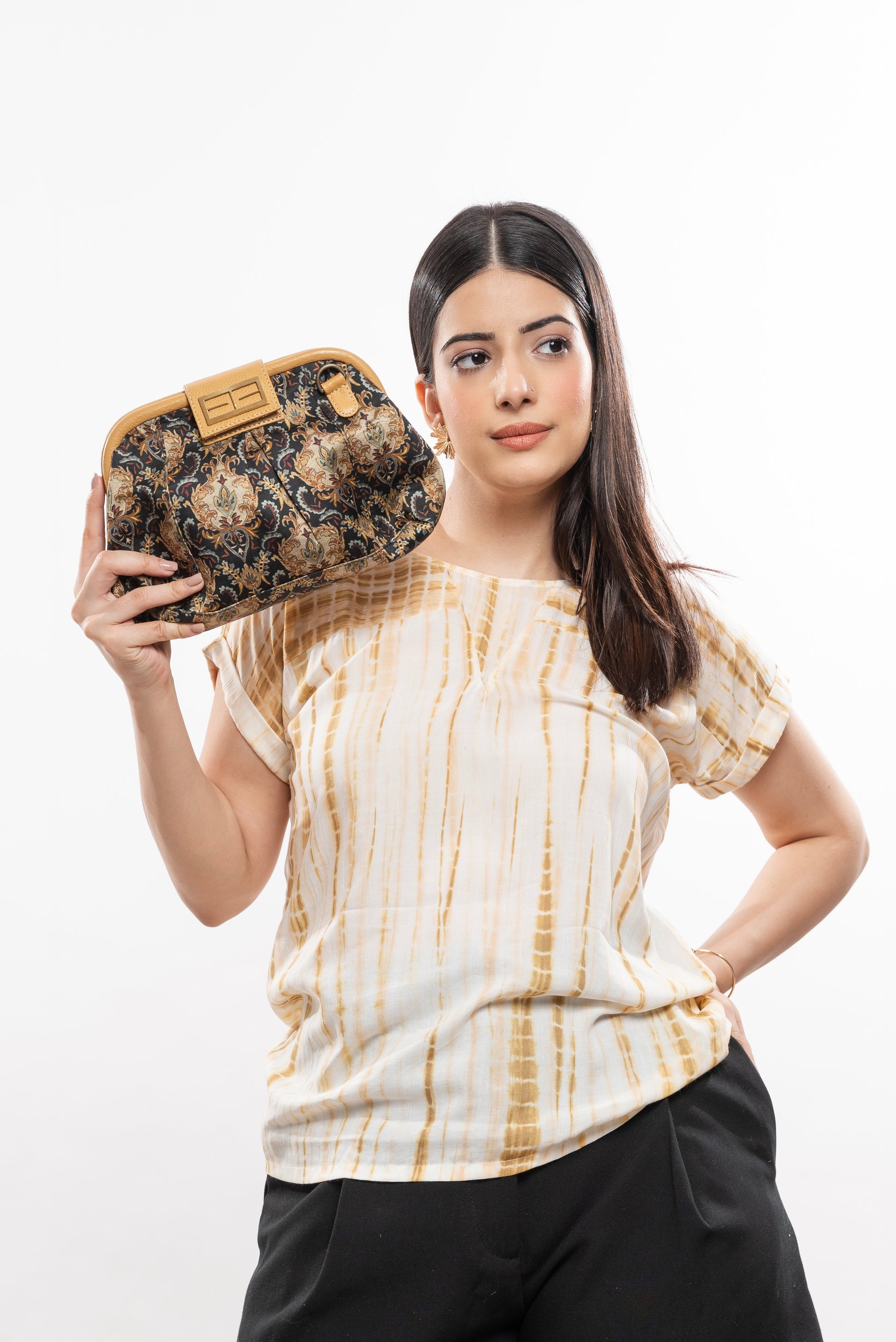 This versatile sling bag cum clutch, crafted from luxurious modal silk with matching leather details, is a perfect blend of elegance and functionality. It features a center box pleat, inside patch pocket, and a zip pocket for added convenience. The adjustable leather strap allows for versatile styling, while the spacious main compartment and two additional pockets keep your essentials organized. Ideal for any occasion, this bag is a must-have accessory for the modern fashionista.