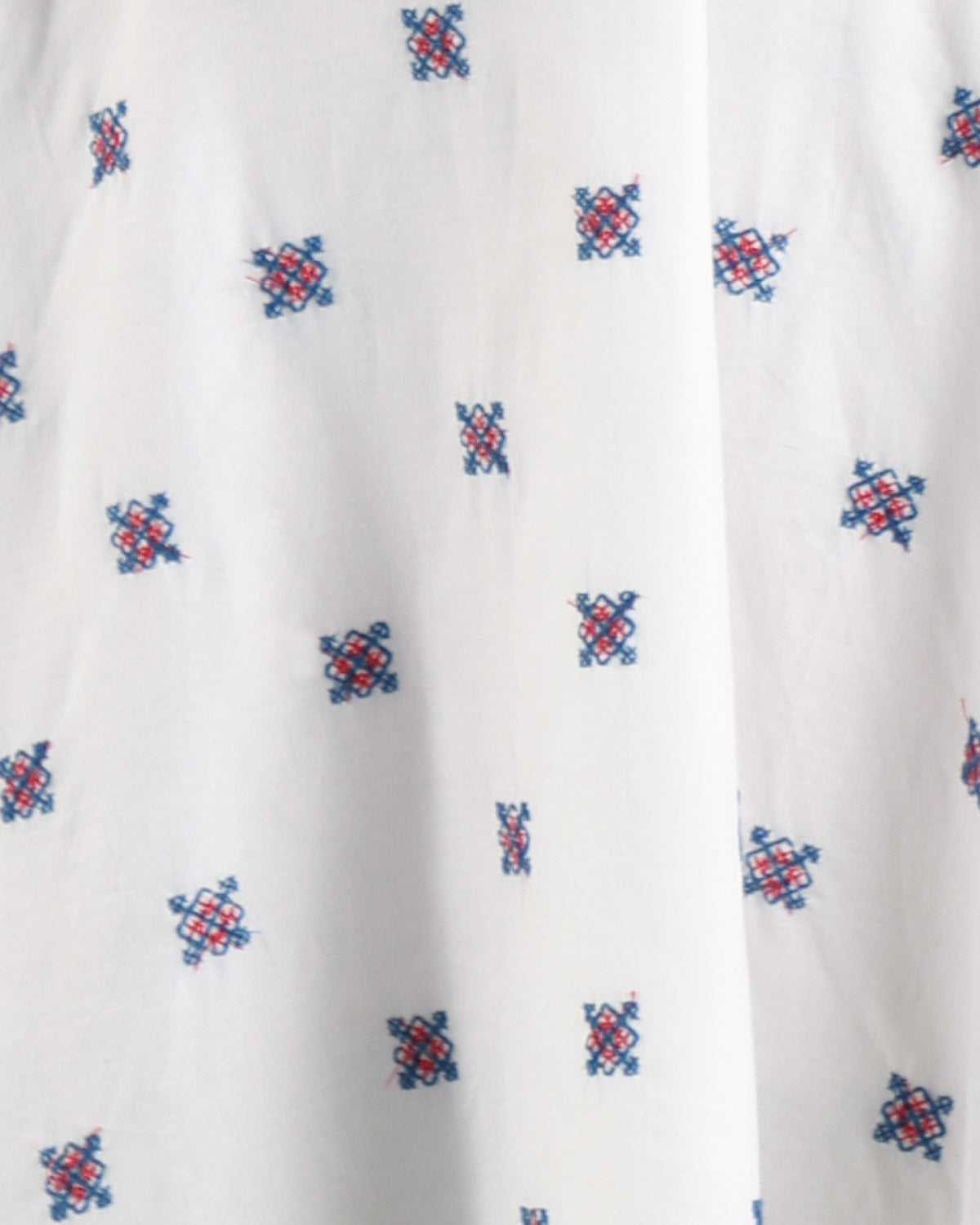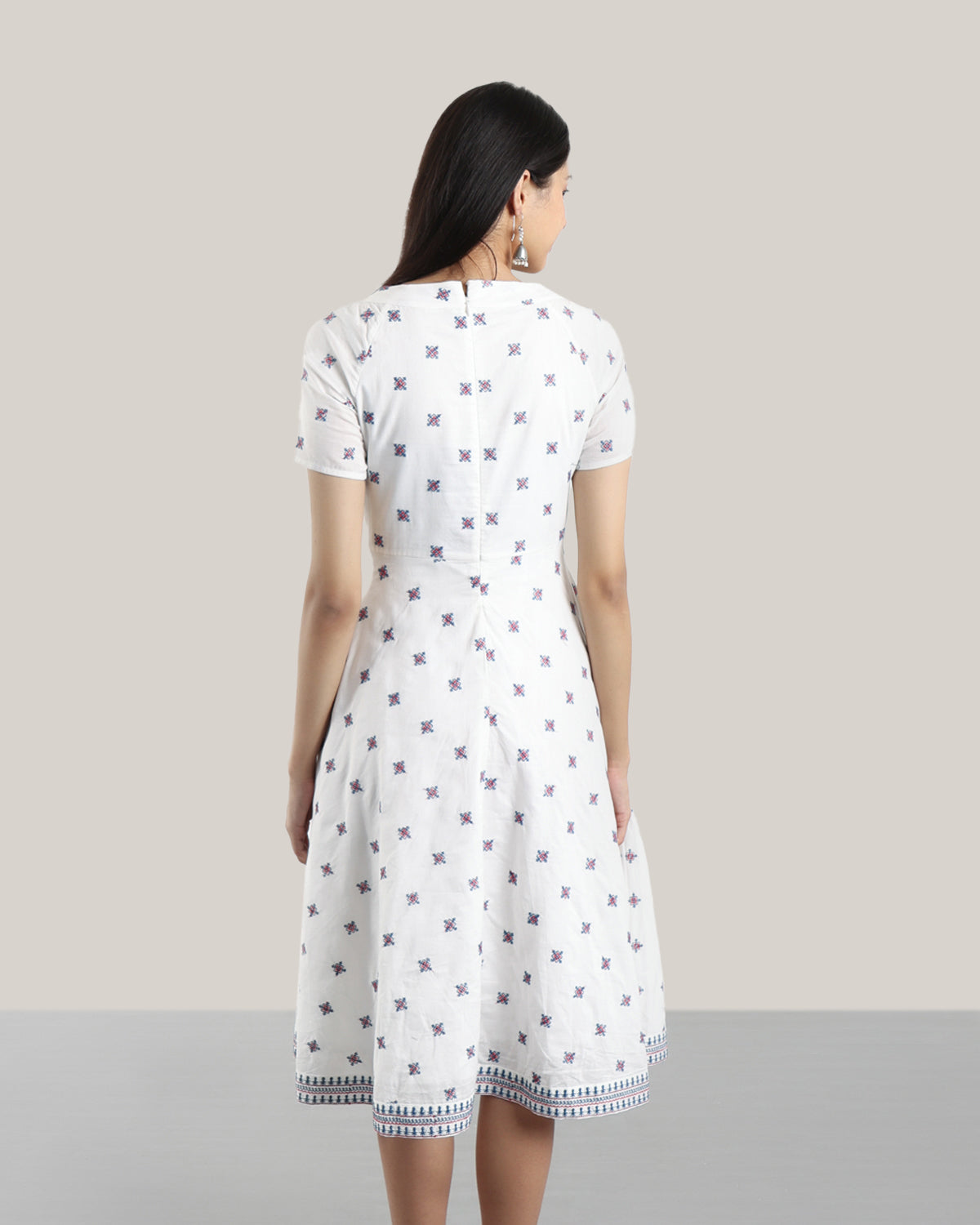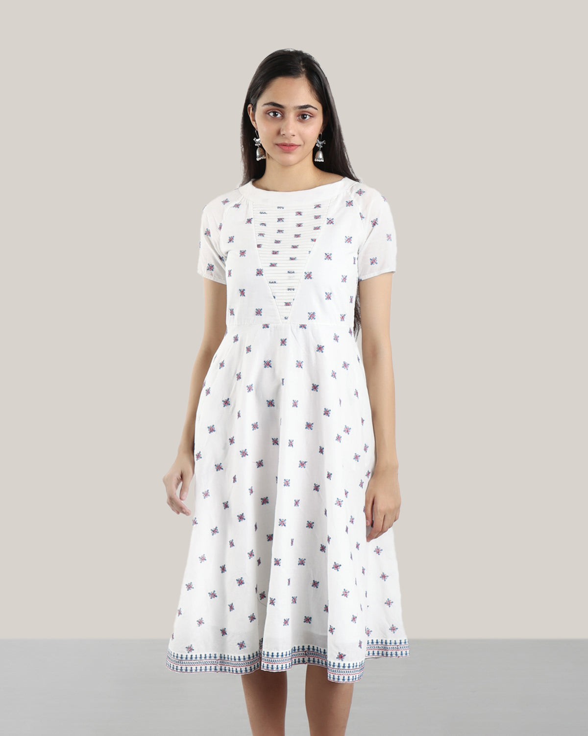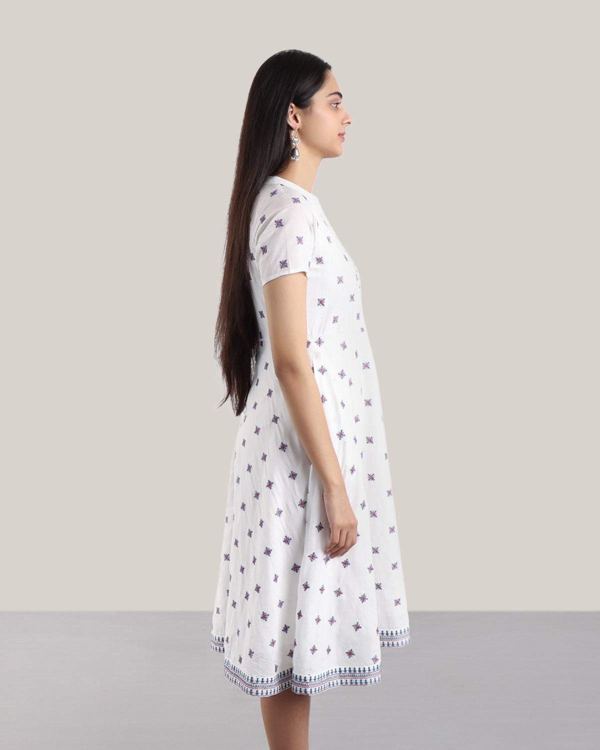 Embroidered frock dress inspired by 90's frock with round neck and V-panel, accentuated with raglan half sleeve and circular flare in Mul Mul that feels just like your second skin.
