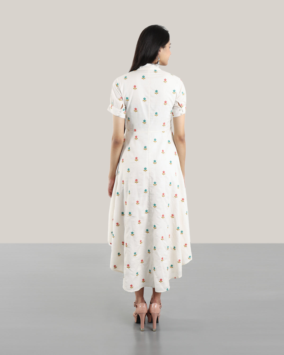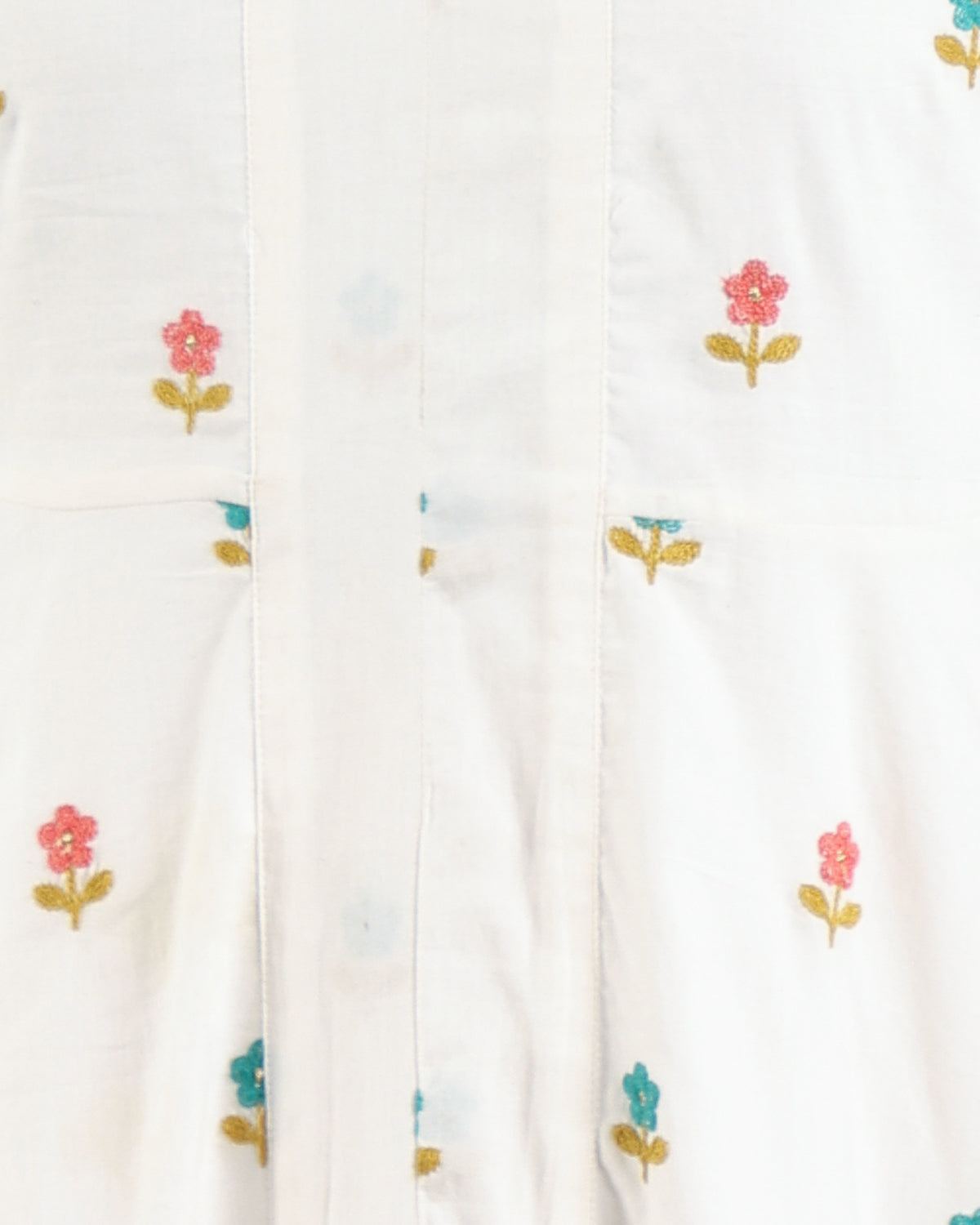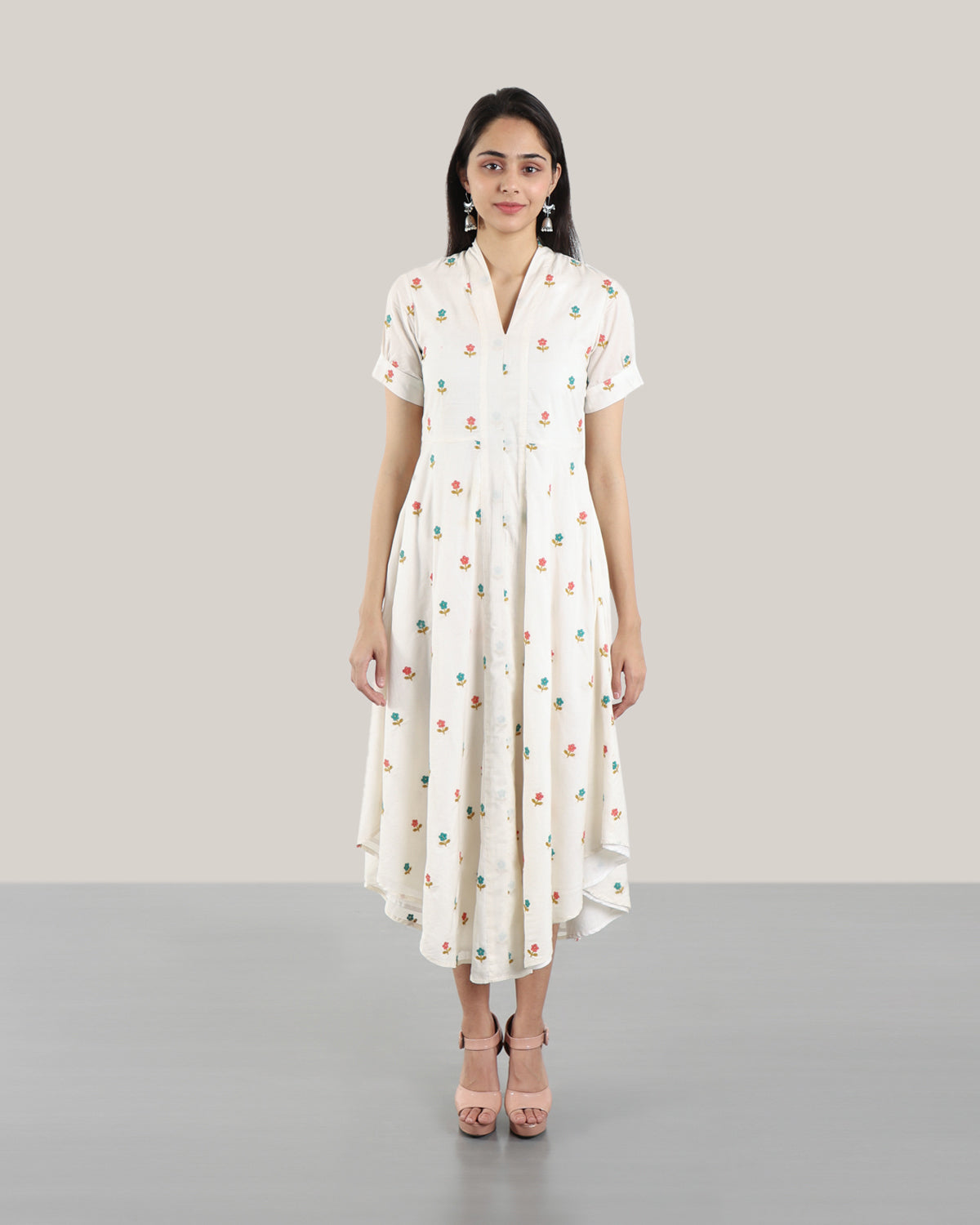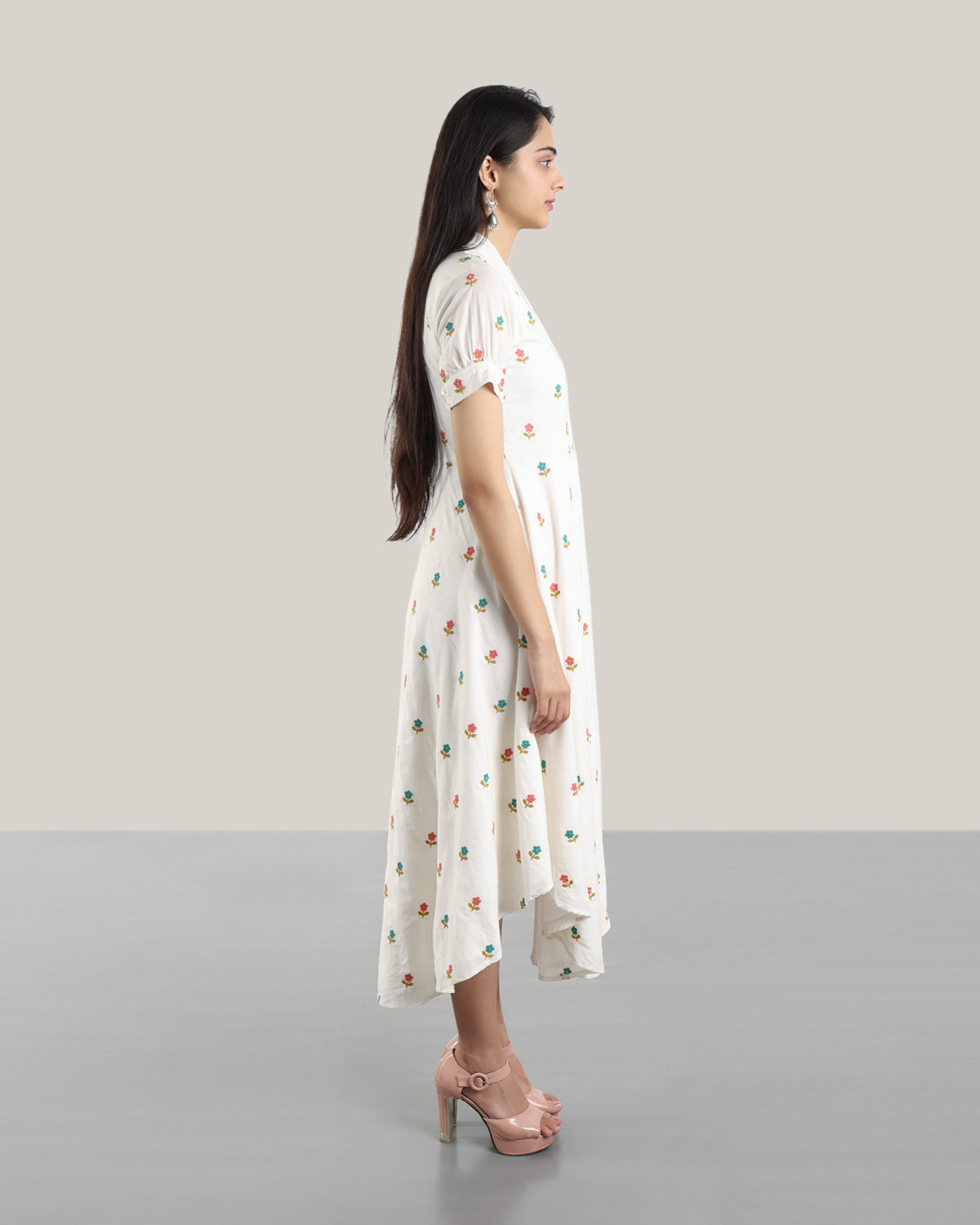 Embroidered melody dress with V-neck, half puff sleeves, accentuated with curved hem in soft Mul Mul that feels feather-light on the skin.