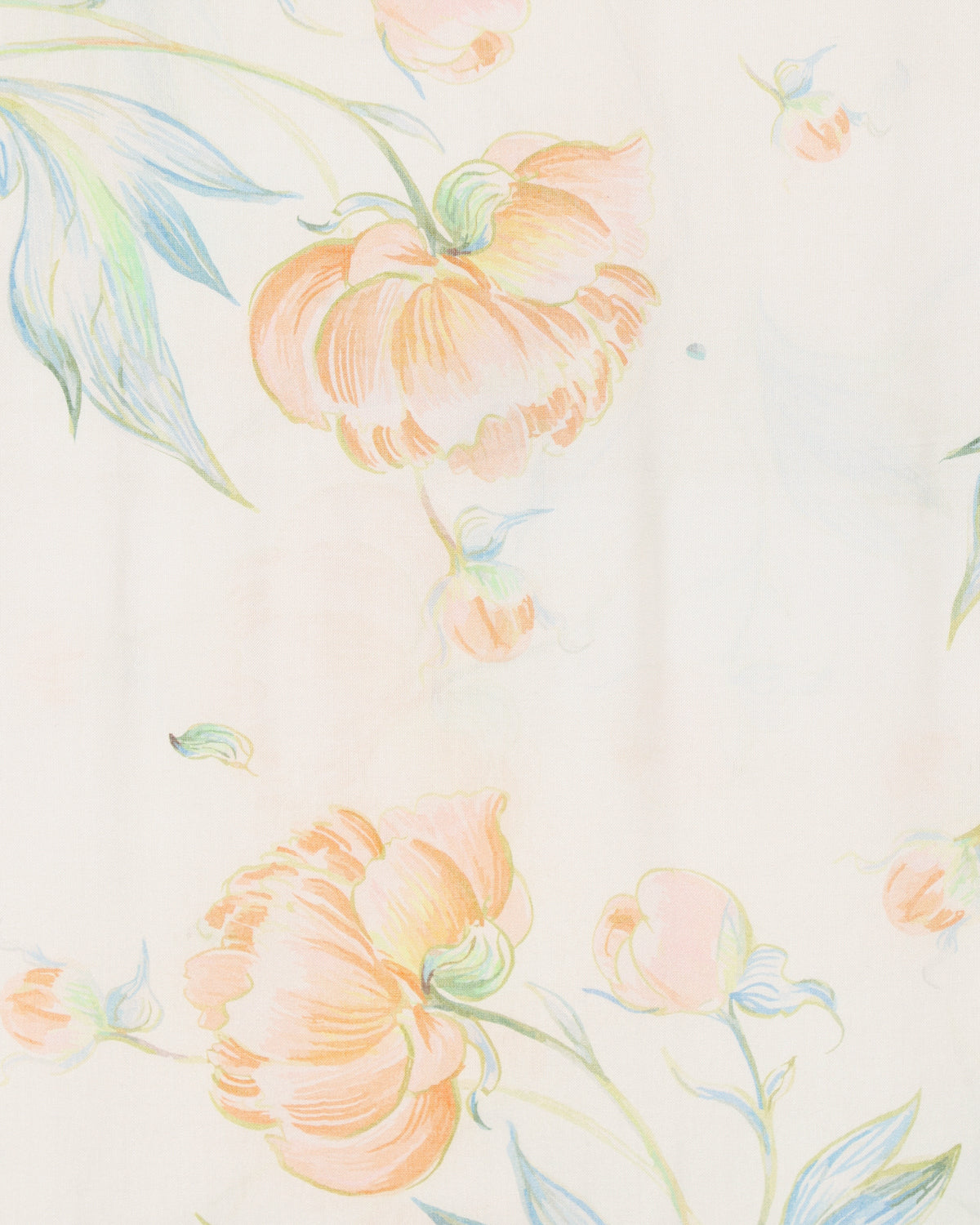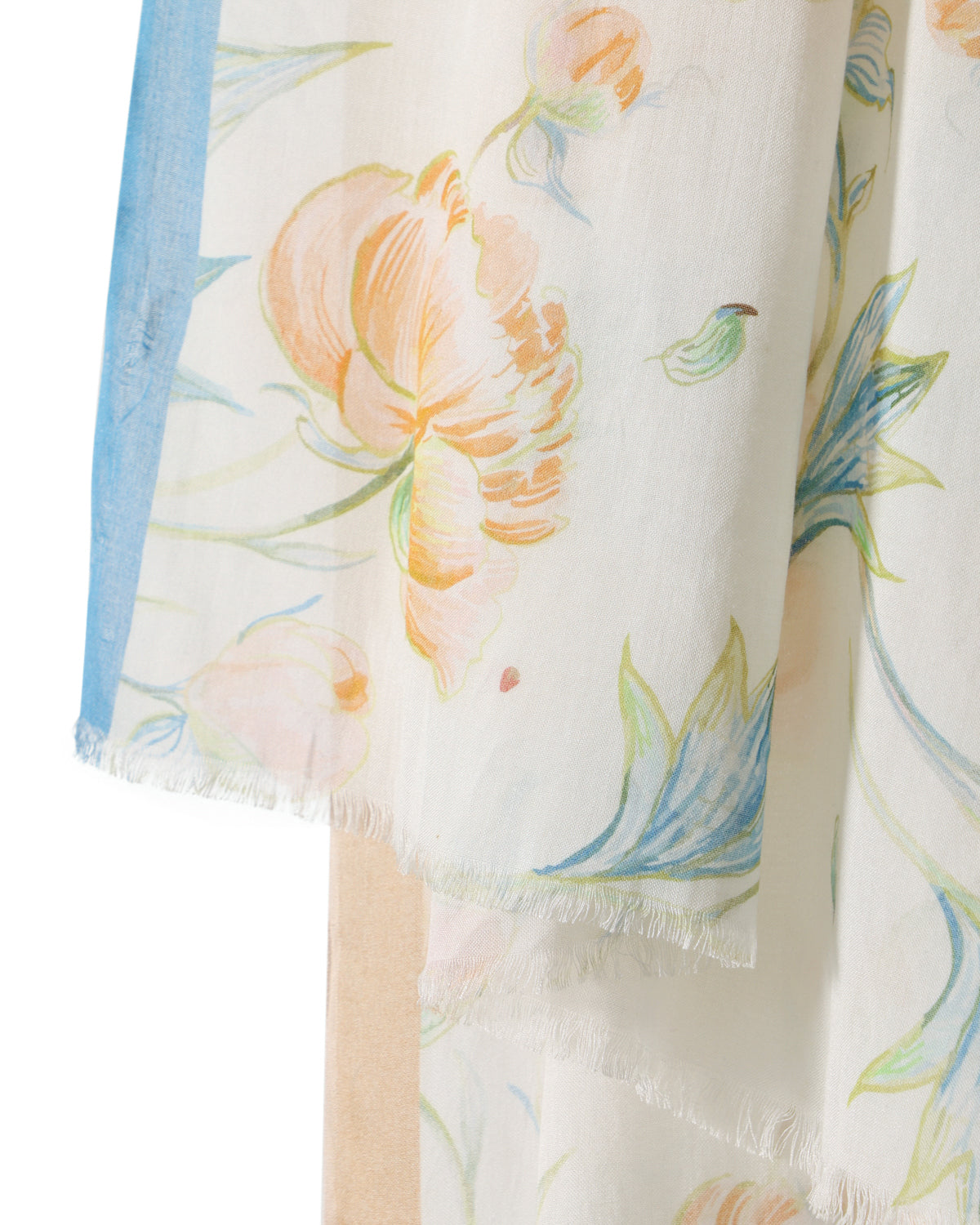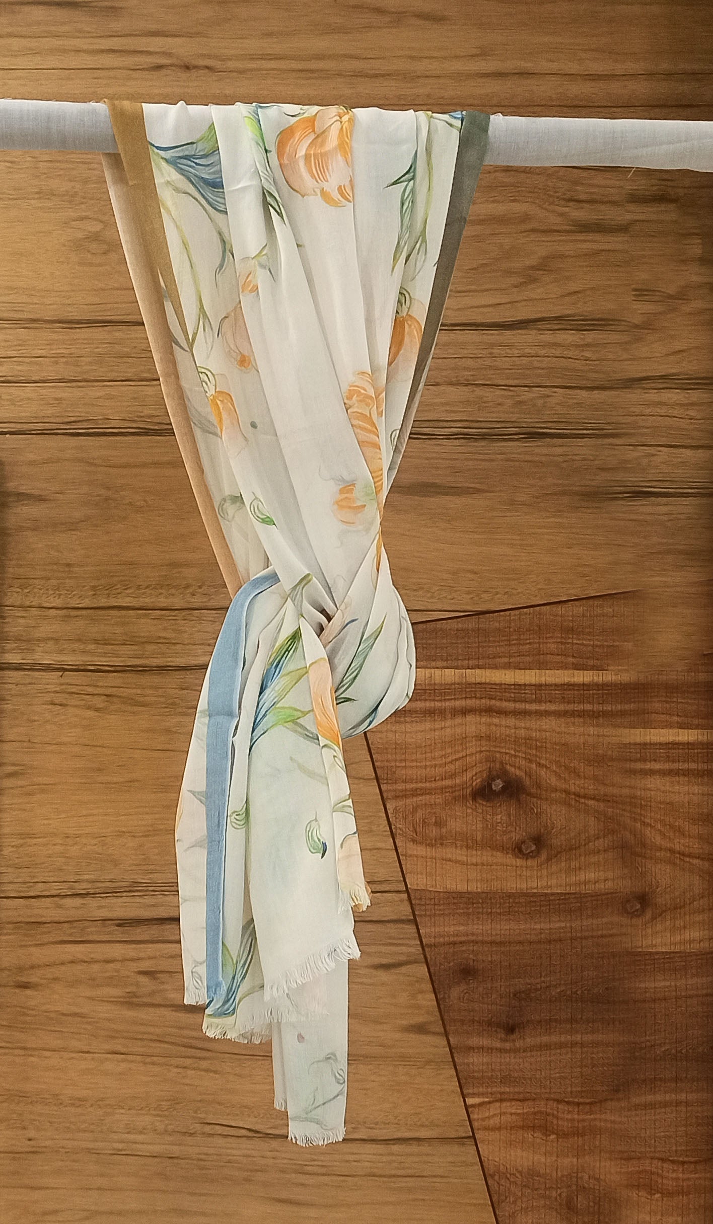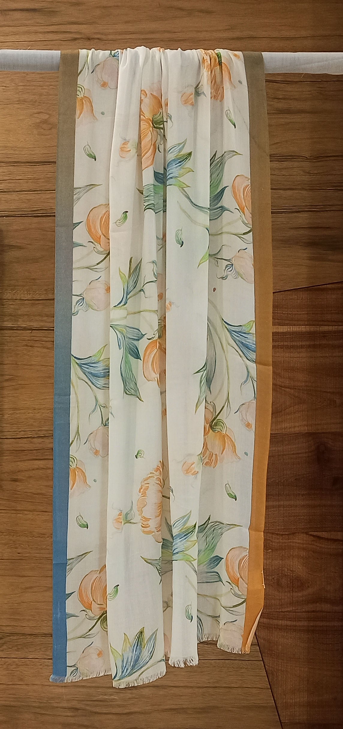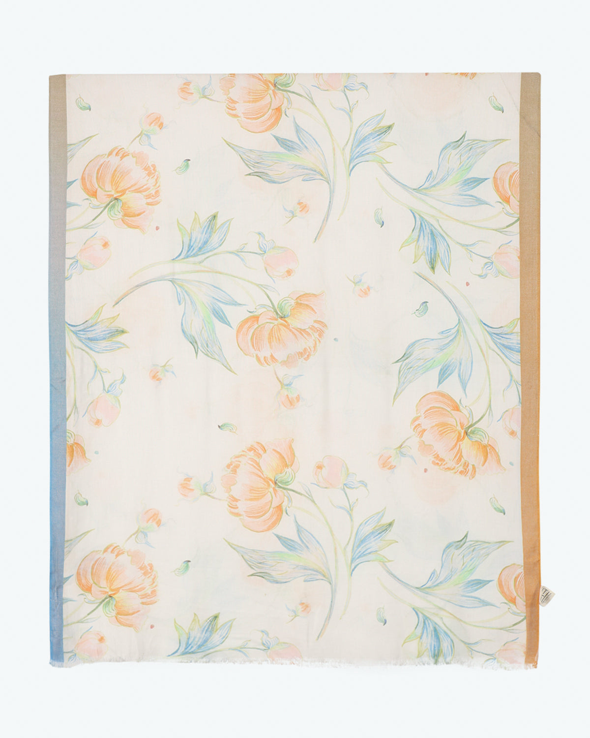 Garden-inspired scarf with orange and blue floral prints on Modal for a soft look.