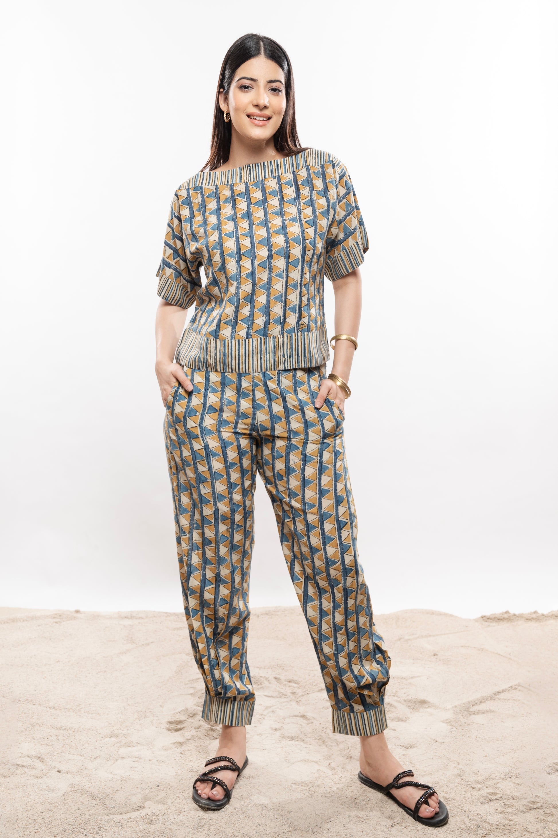 The Geometric Overlay Co-Ord Set amalgamate modern style with traditional charm, featuring a straight-neck, half-sleeve top adorned with contrast print details. Paired with tapered pleated pants, this regular-fit set is crafted from soft Mul Mul fabric and showcases a striking block print, making it a perfect mix of comfort and elegance.