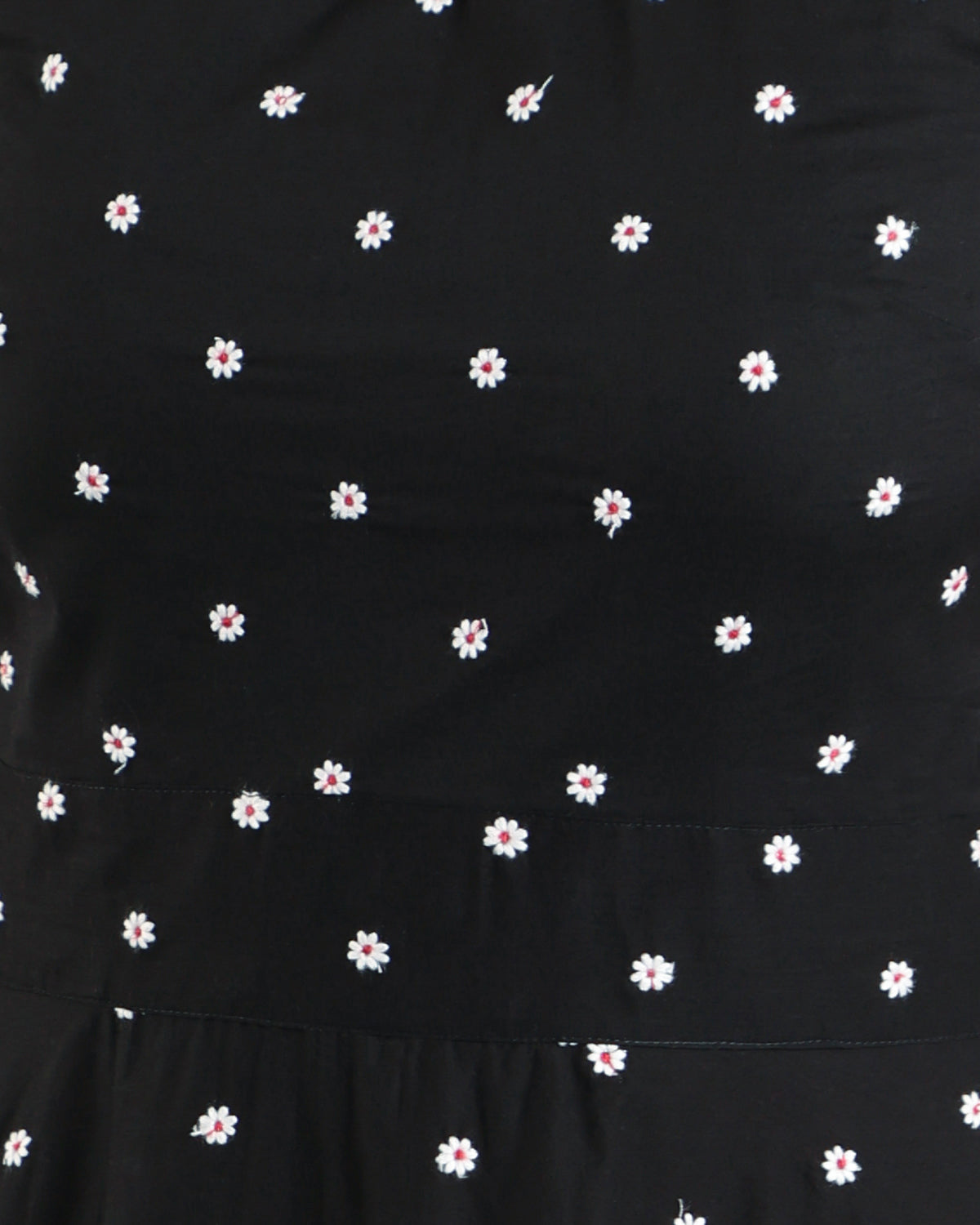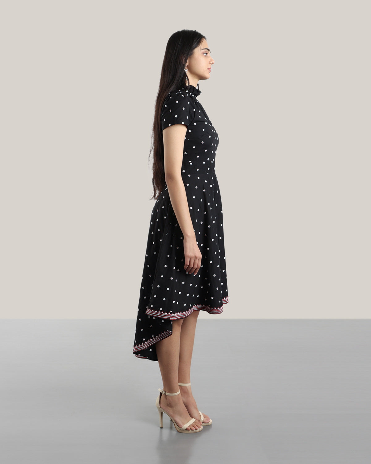 Hi-low Ballare dress with a close neck and frill and embroidered hemline crafted from Supma Cotton, embodying elegance and grace.