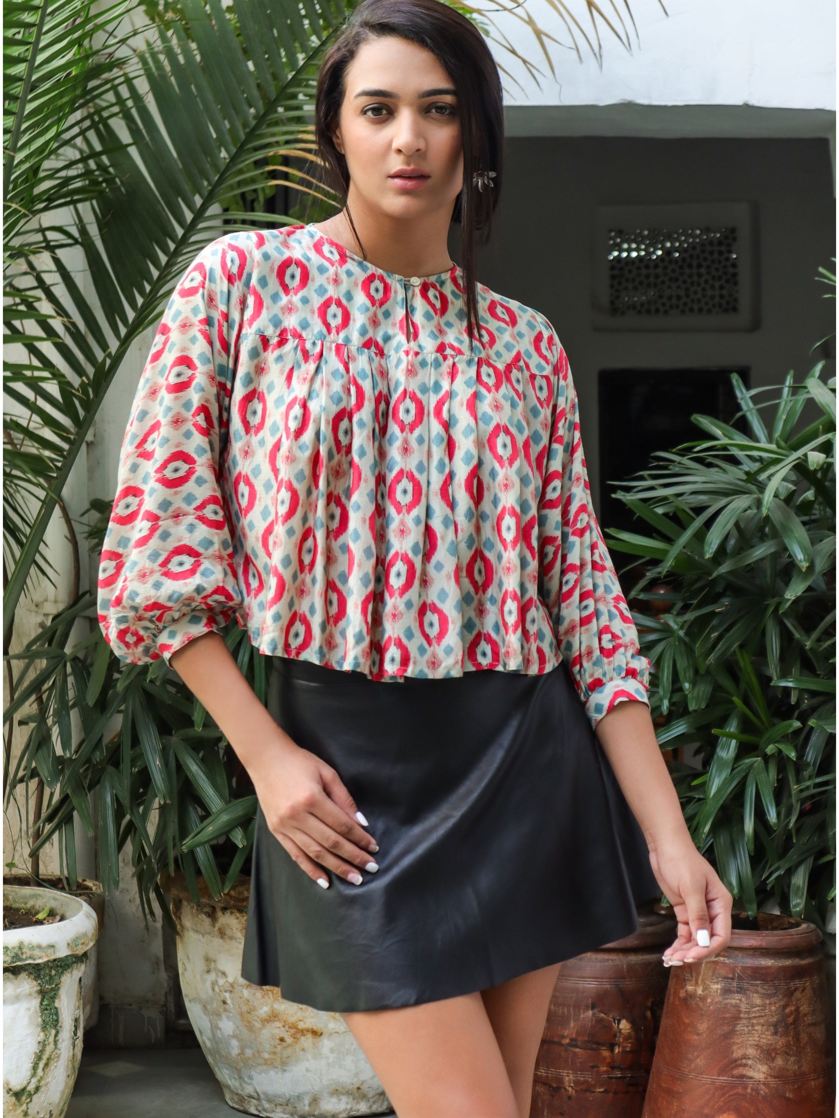 Elegant round neck top featuring pleat details, 3/4 Dolman sleeves, and a charming keyhole detail. Crafted from luxurious Egyptian cotton for ultimate comfort and style.