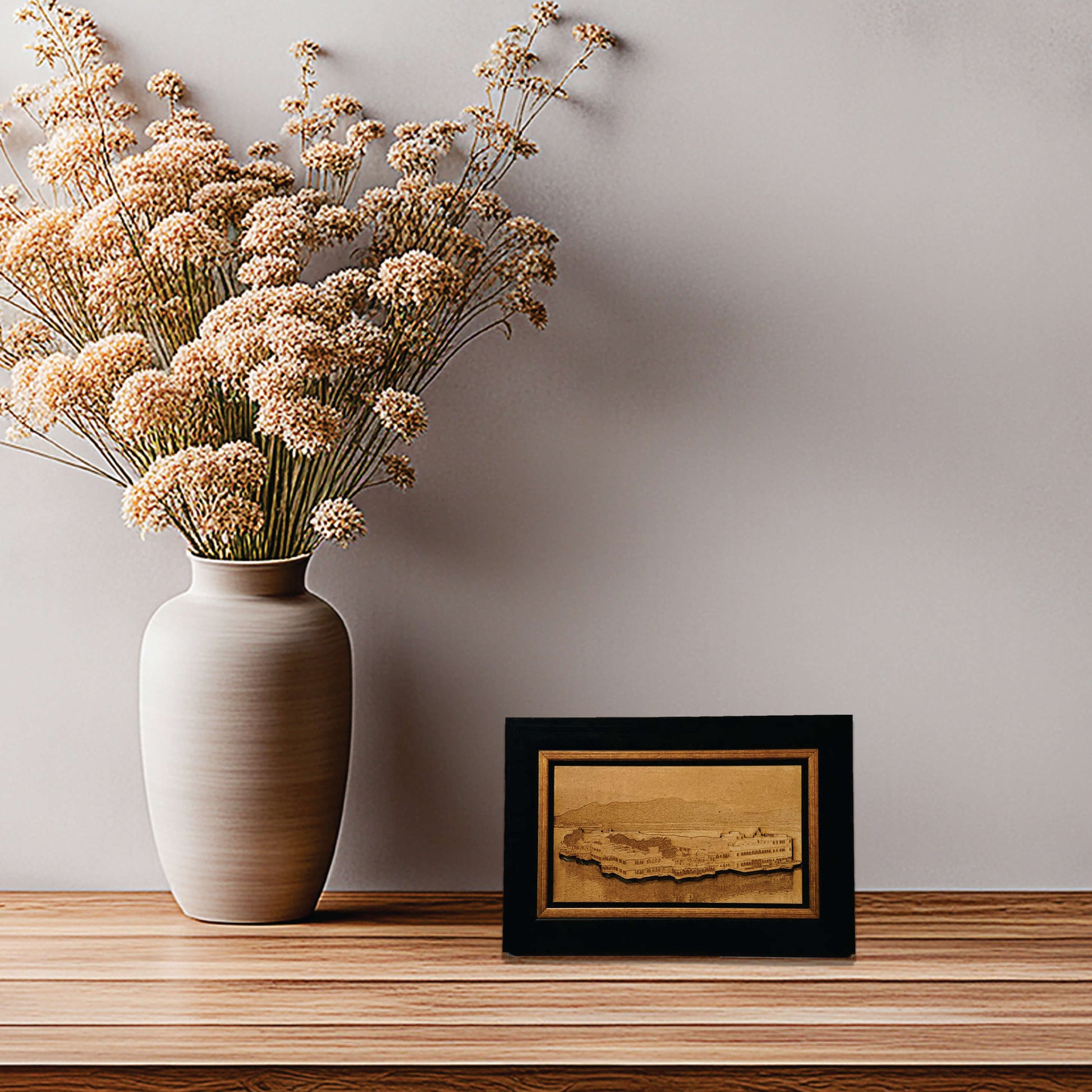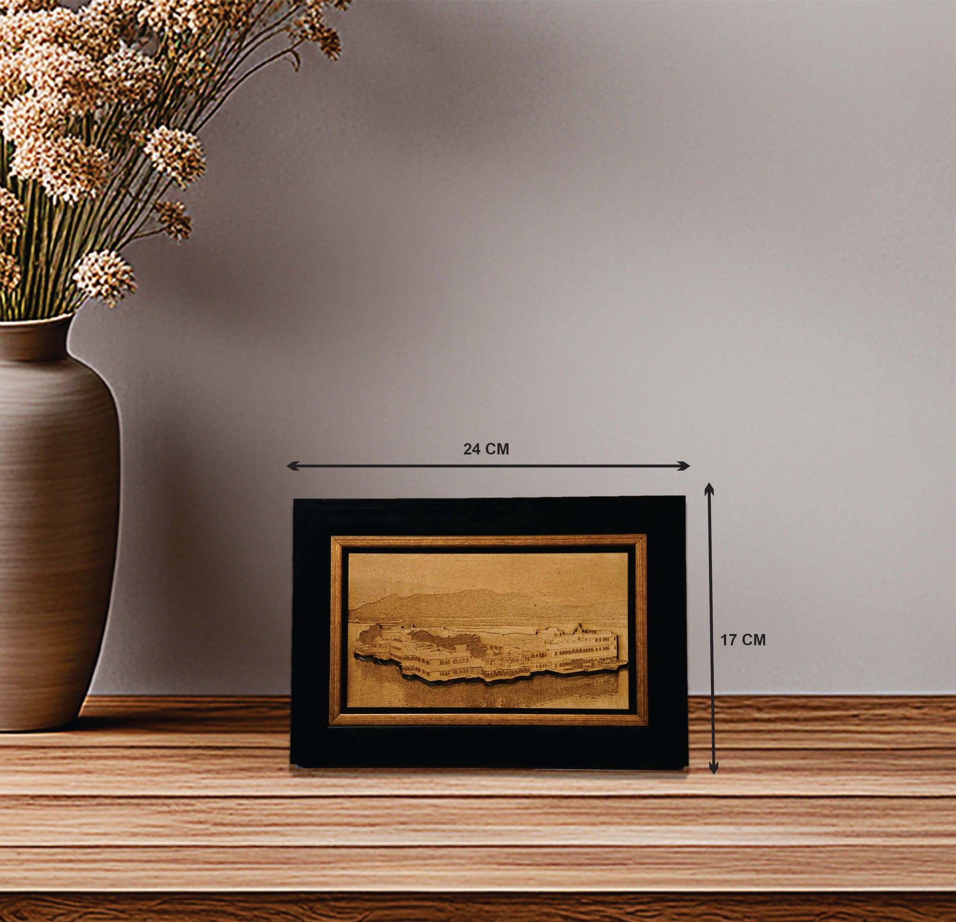 This wall frame is made with attention to detail with delicate wood engraving of picture of Taj Lake Palace, Udaipur.