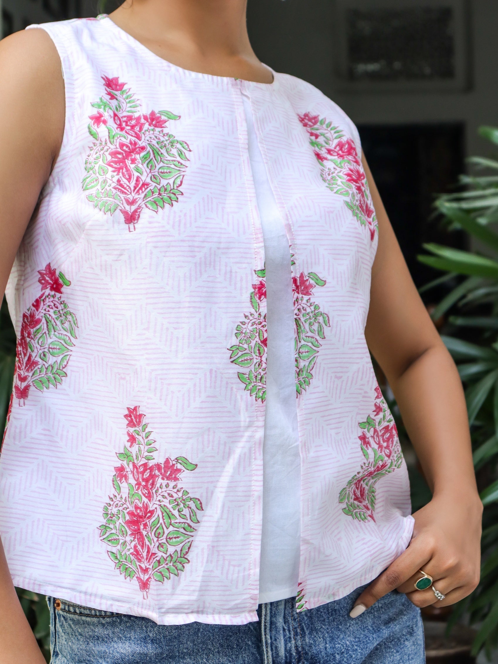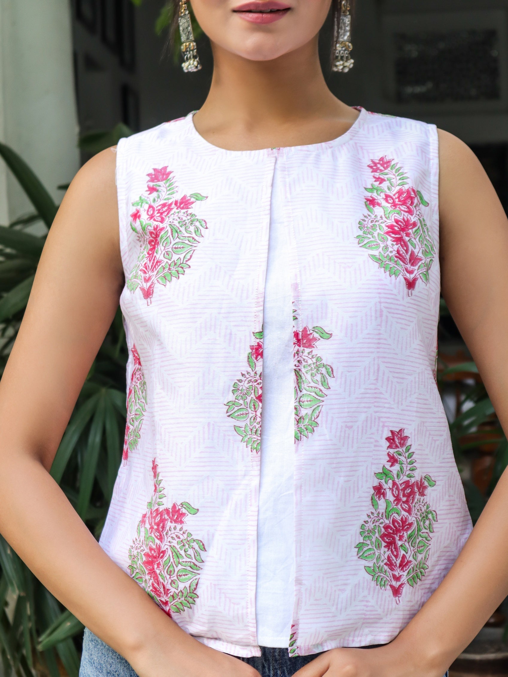 This layered sleeveless top with a round neck featuring floral motifs comes with an open slit in front which makes it chic and stylish.