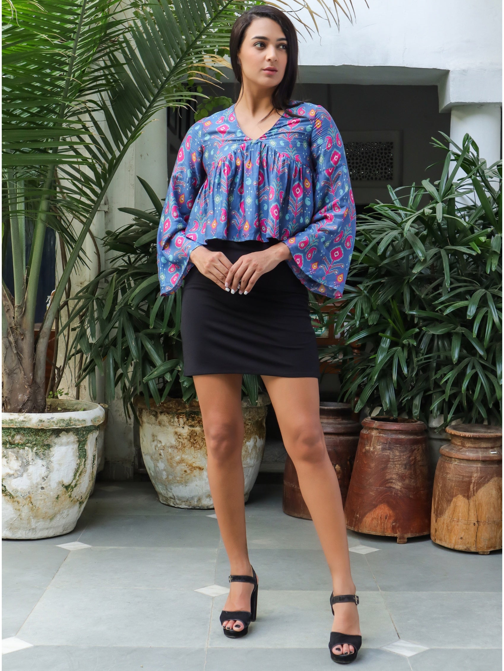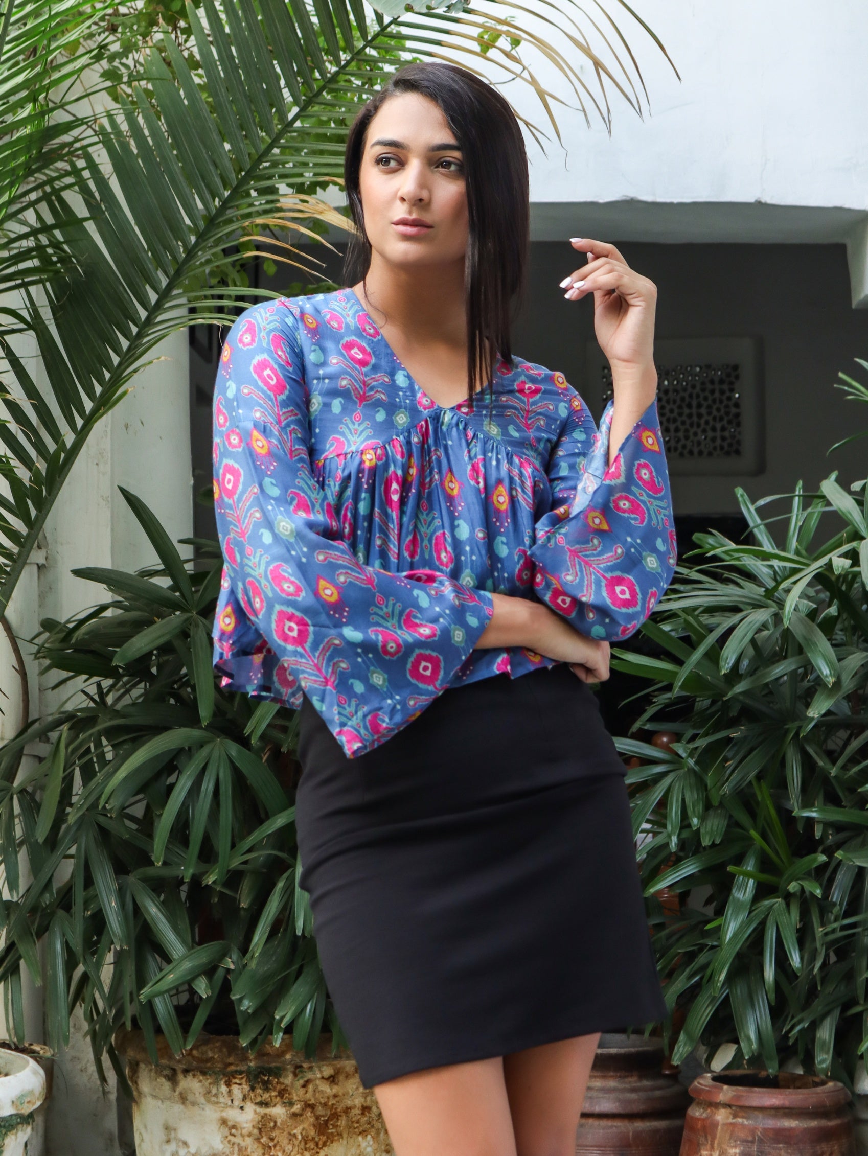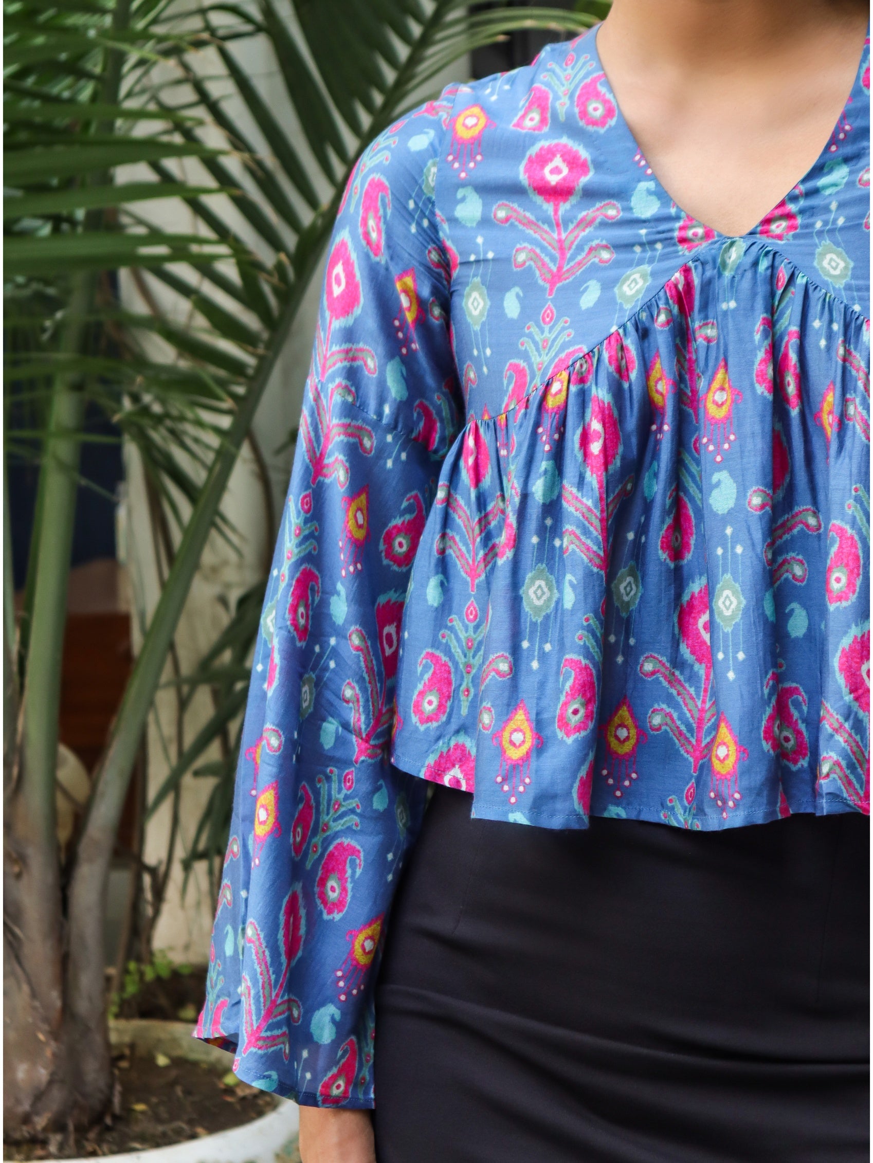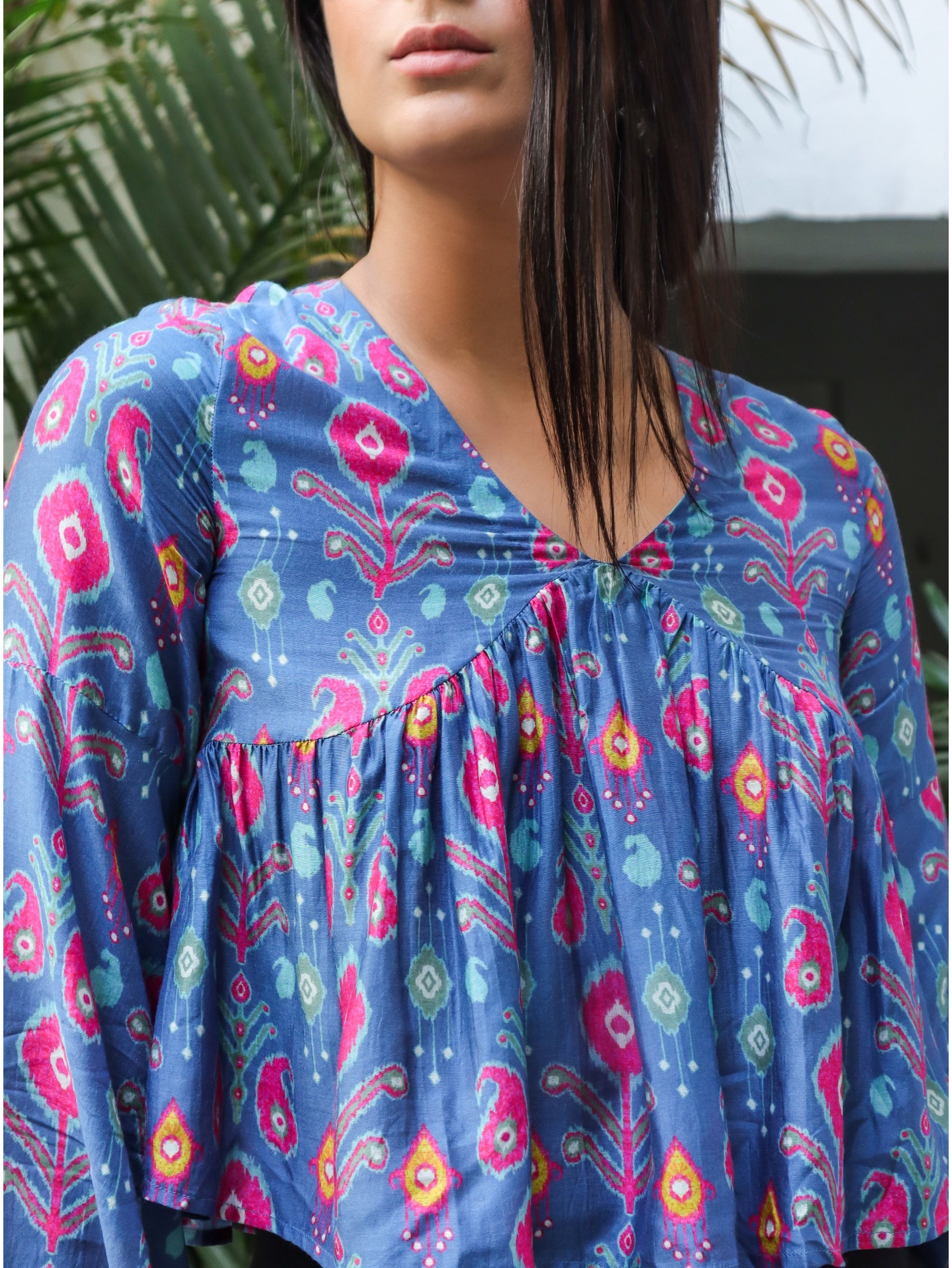 Lily Paisley Top is a V-neck panelled top with flared bell sleeves and a flared hem. Perfect for a chic, Bohemian look.