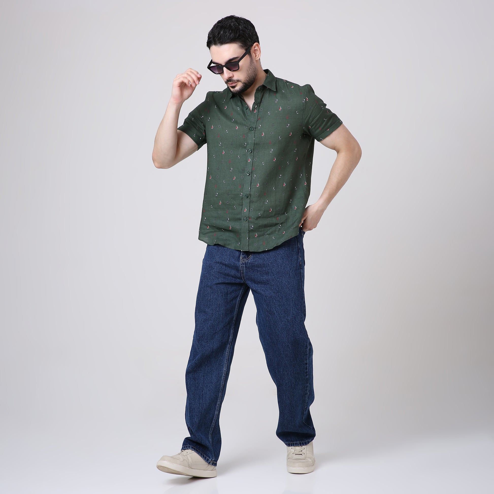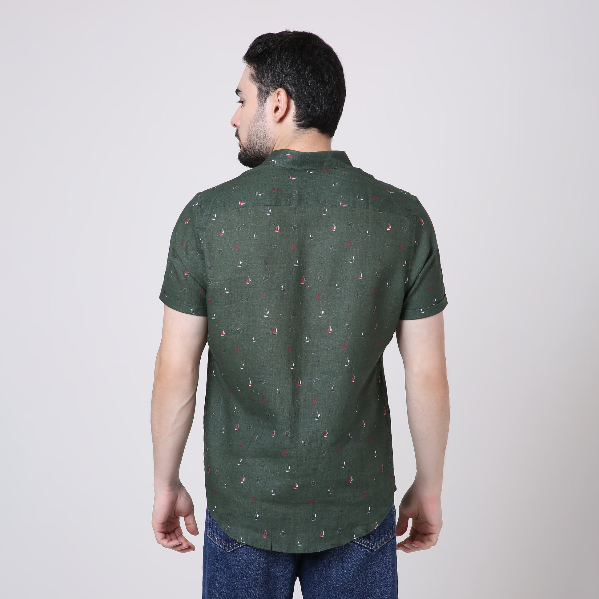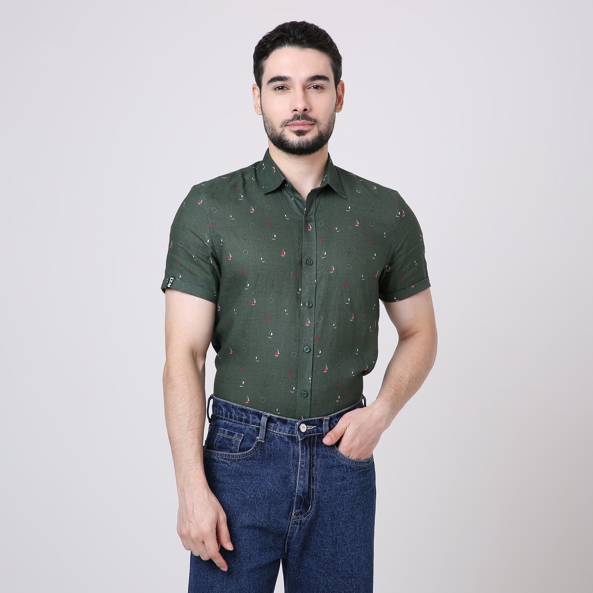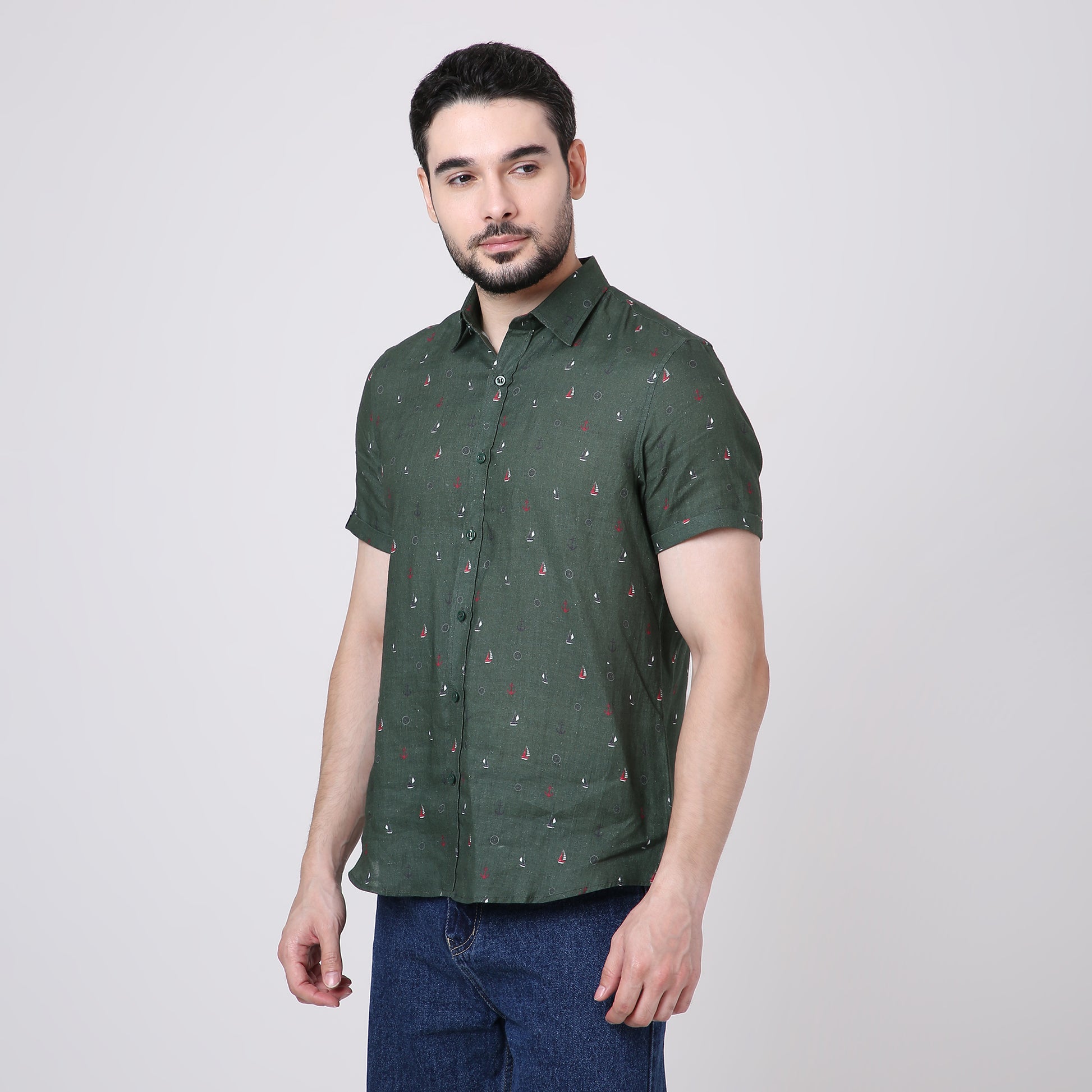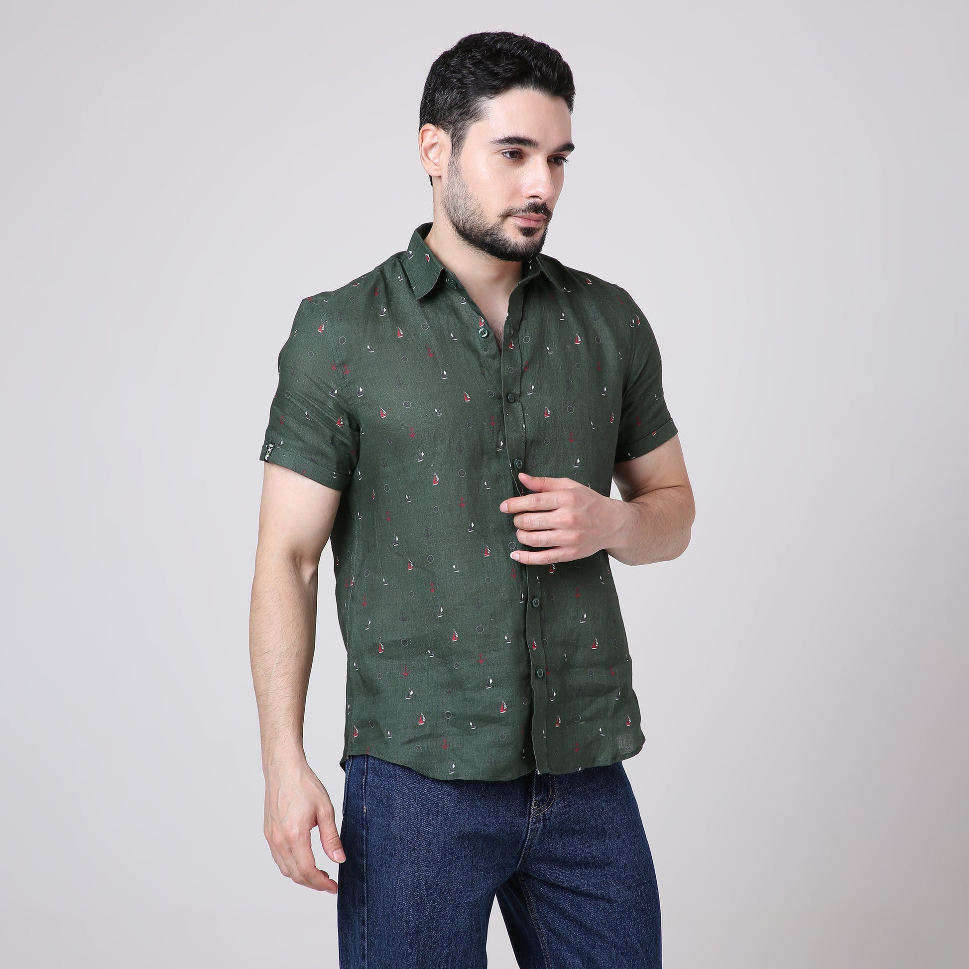 Breathe easy in this forest green linen half sleeve shirt, featuring a subtle sailboat print for a relaxed yet refined look. Lightweight, airy, and effortlessly stylish — it’s your perfect pick for warm days and easy evenings.