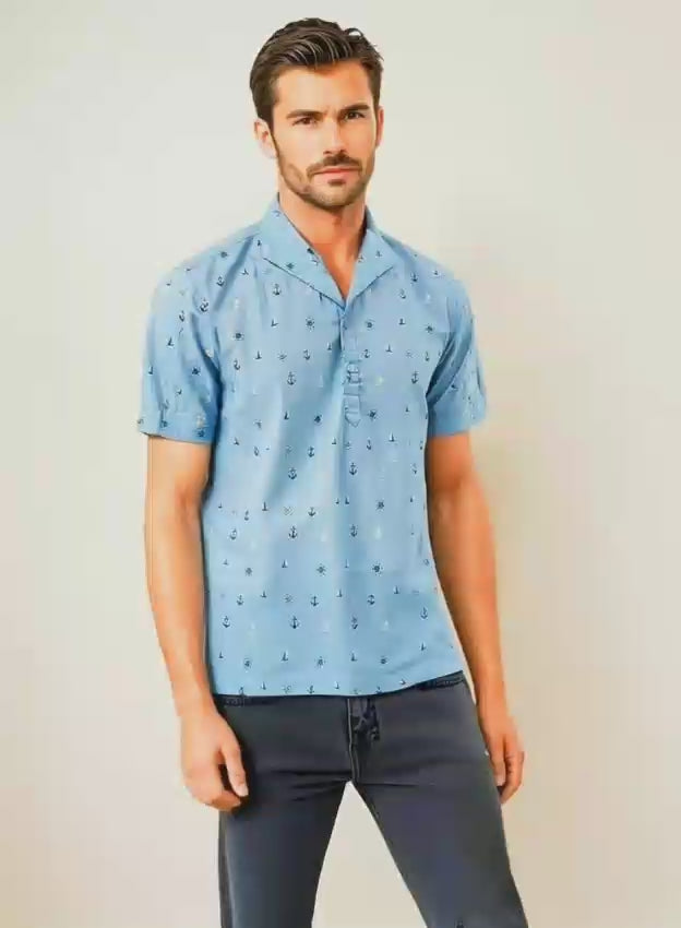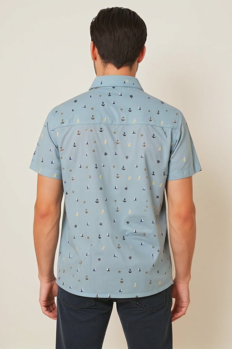 Crafted from a breathable bamboo-cotton blend, this sky-blue short-sleeve shirt features a half placket with button closure & a diff. style collar. A playful nautical print gives a Sail through summer effortless style. Lightweight, soft, and eco-friendly — it’s designed for all-day comfort with a refined casual vibe