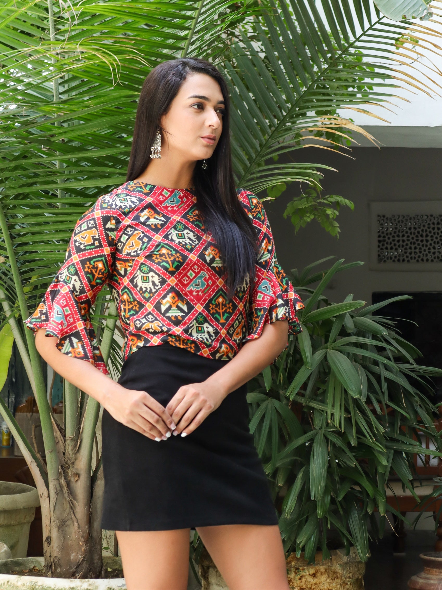 Elegant and playful, Patola matrix top features a round neck, ruffled 3/4 sleeves, and a charming design. Perfect for a casual yet stylish look.