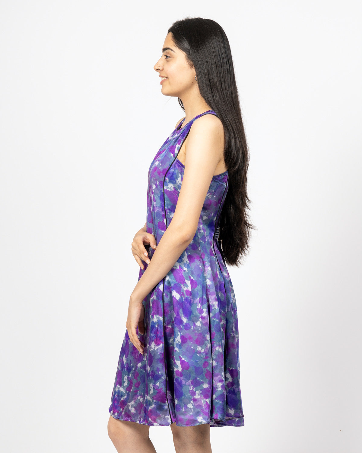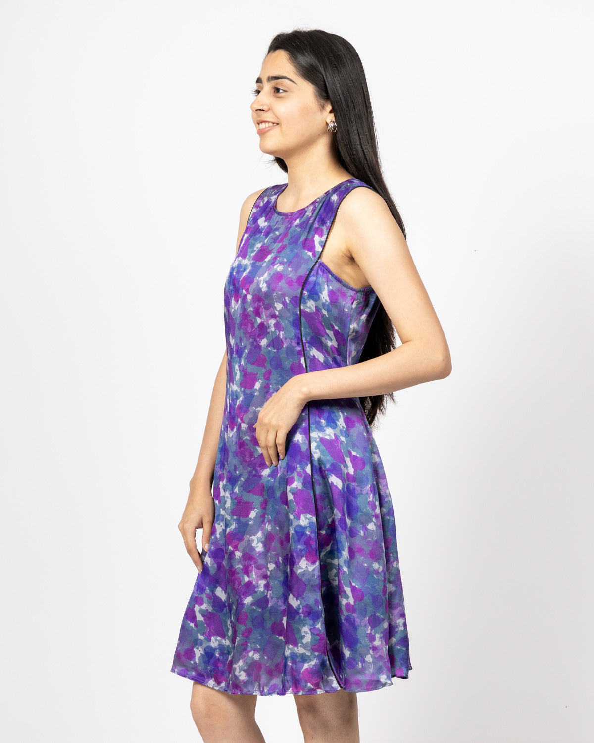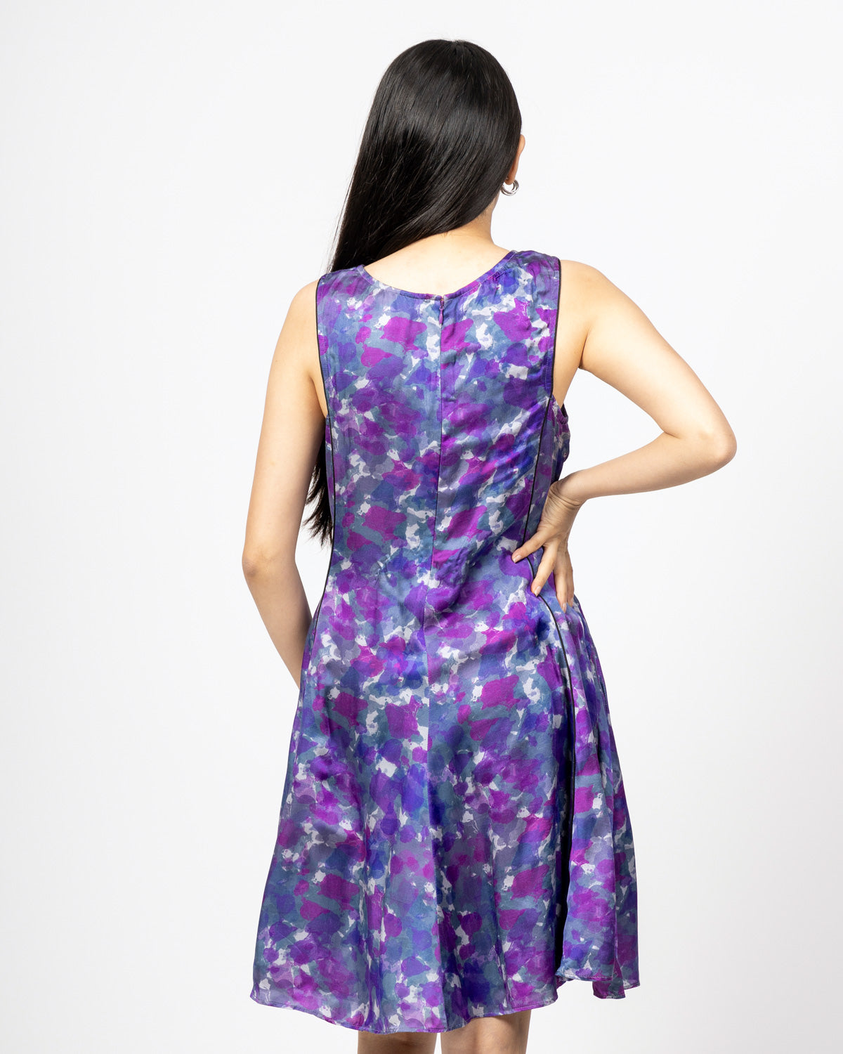 Abstract print, Umbrella dress, crafted from luxurious modal satin. This knee-length dress features a round neckline, sleeveless design with princess seams, and a flowing umbrella flare. The abstract print and comfort fit make it an ideal choice for any occasion.