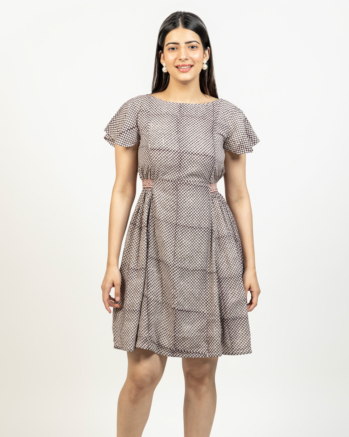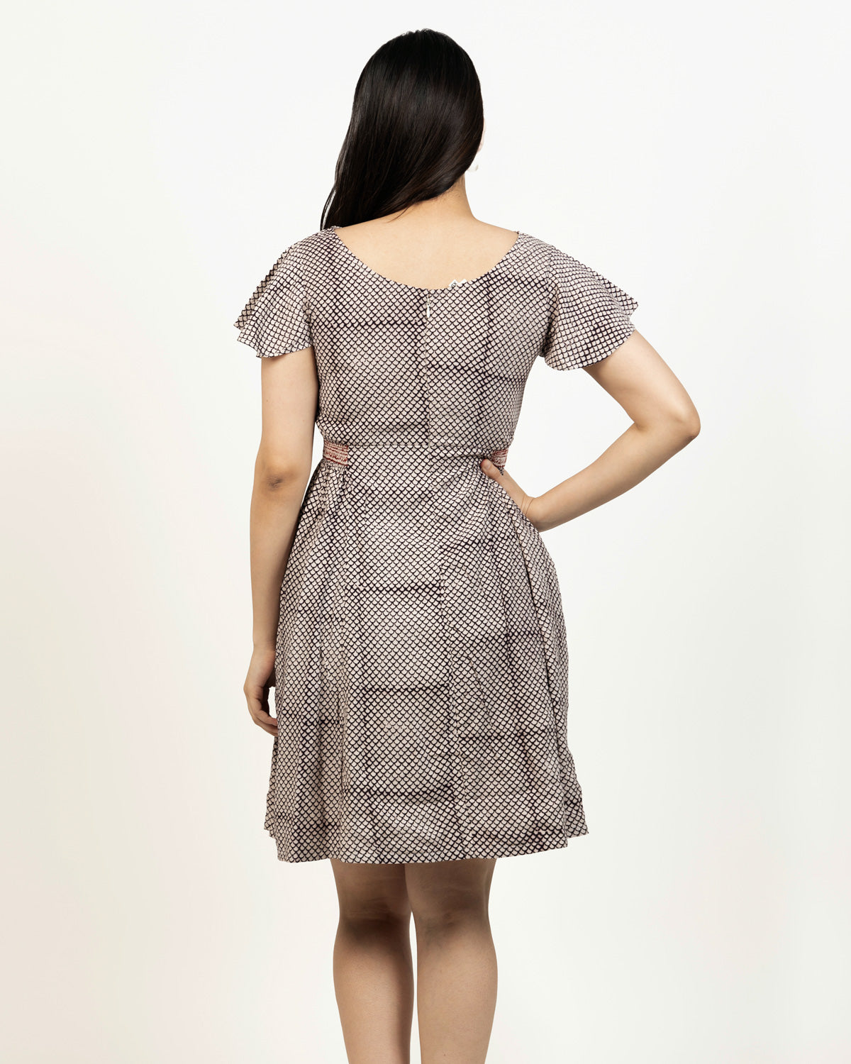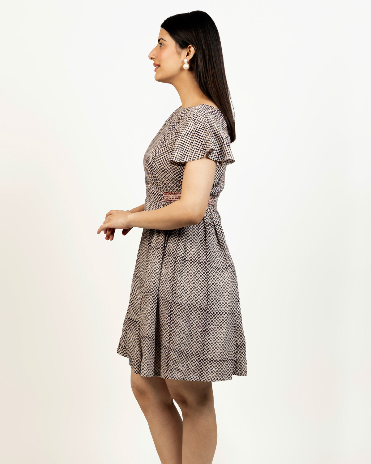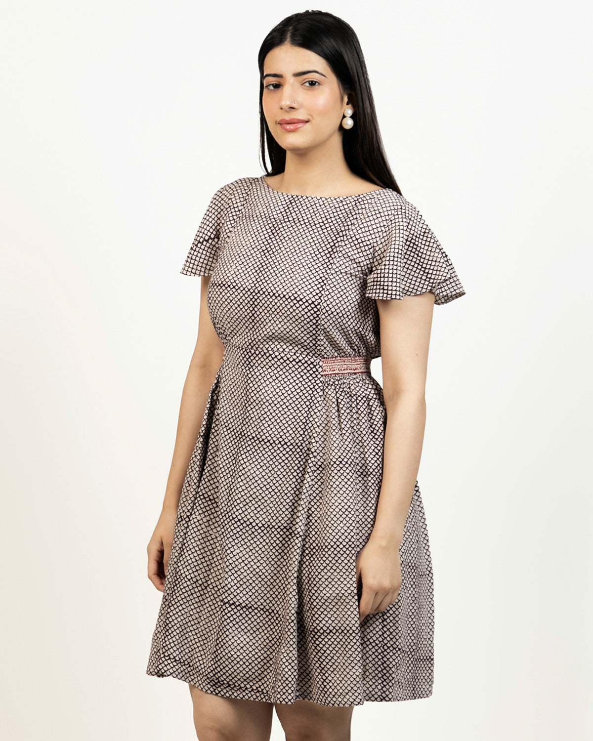Block Print Flared Dress, crafted from soft mul mul fabric. Knee length dress features a round neckline, ruffled sleeves, and a smocked waistline for a flattering fit. The comfortable flared design and intricate block print make it perfect for any occasion.