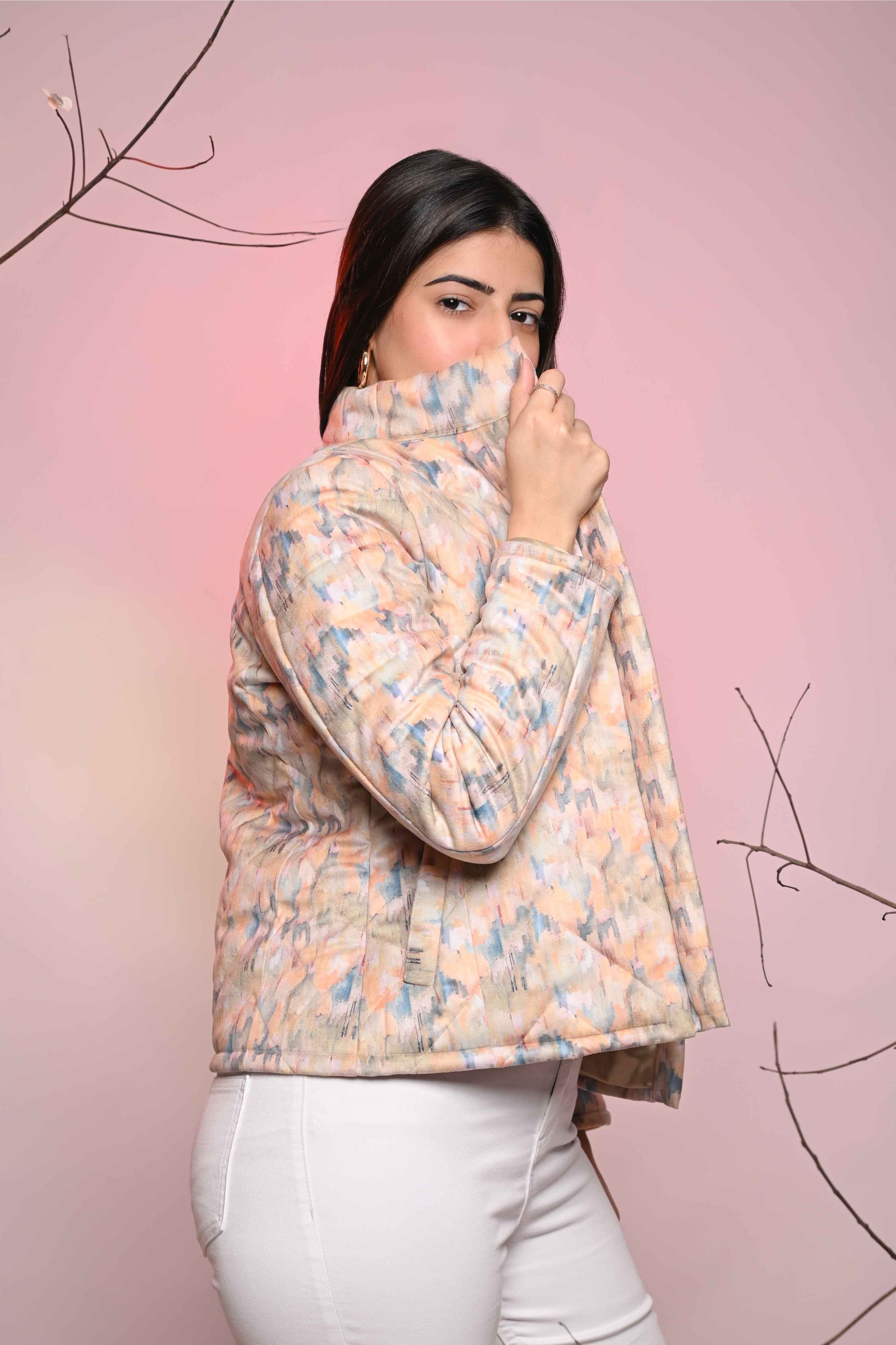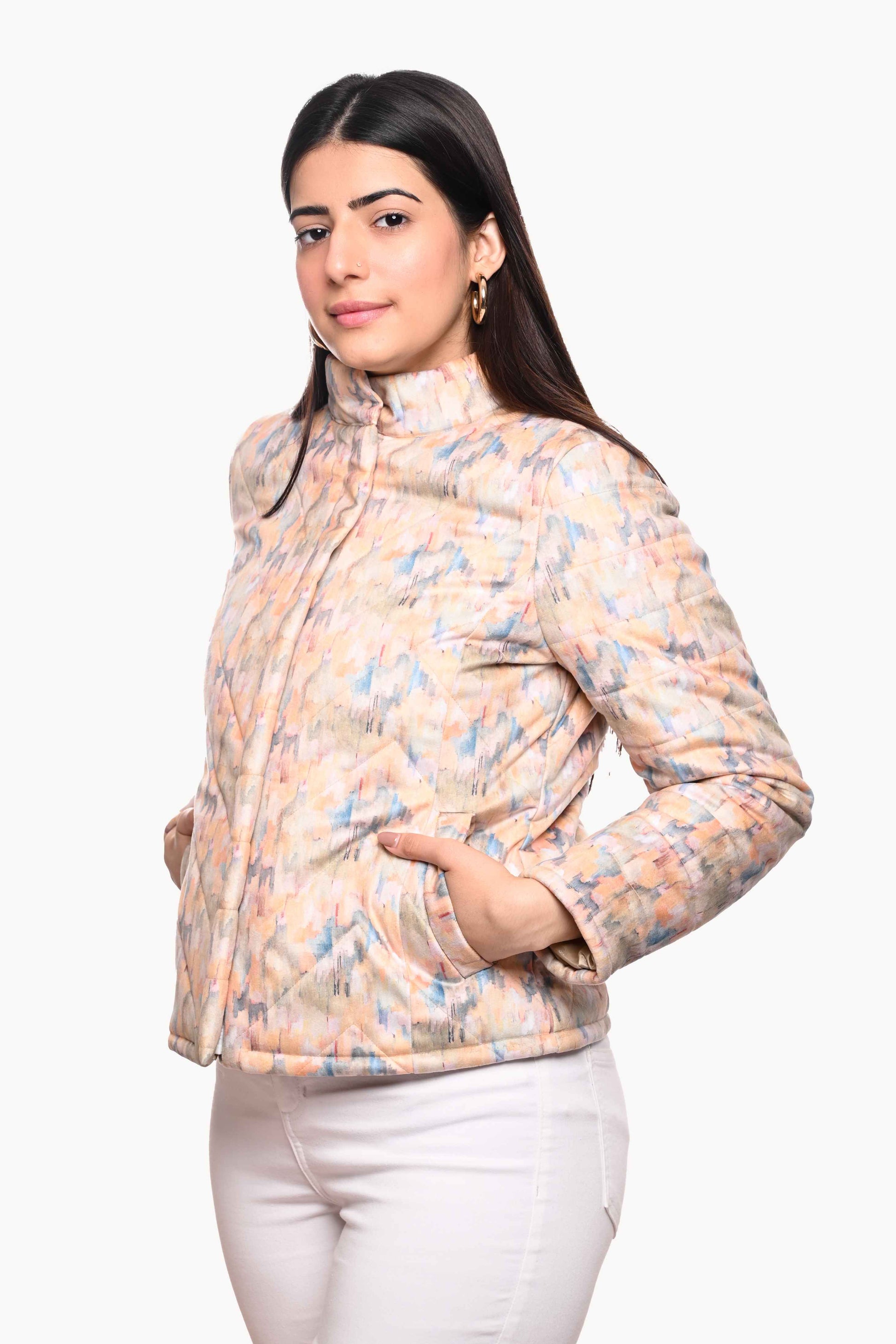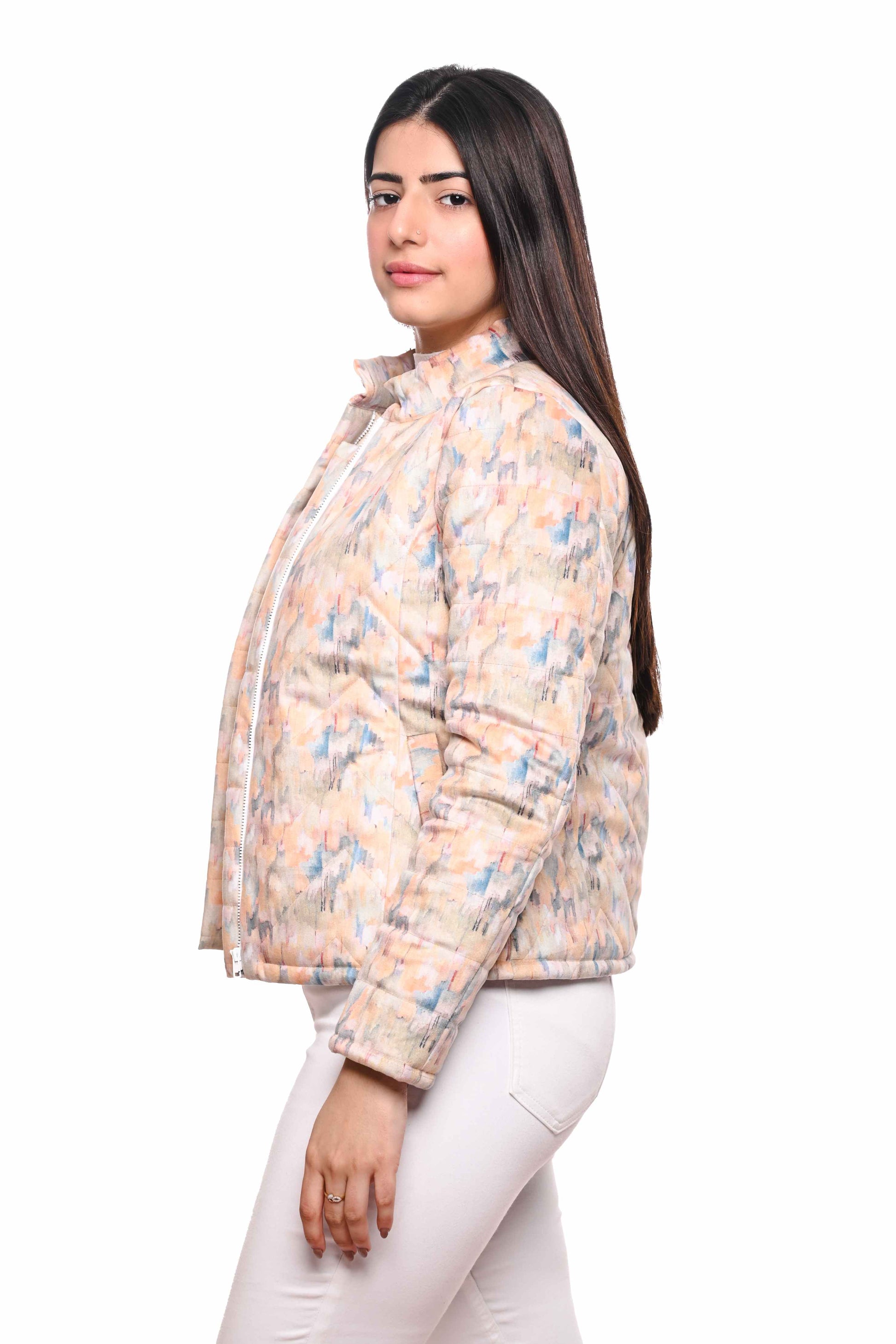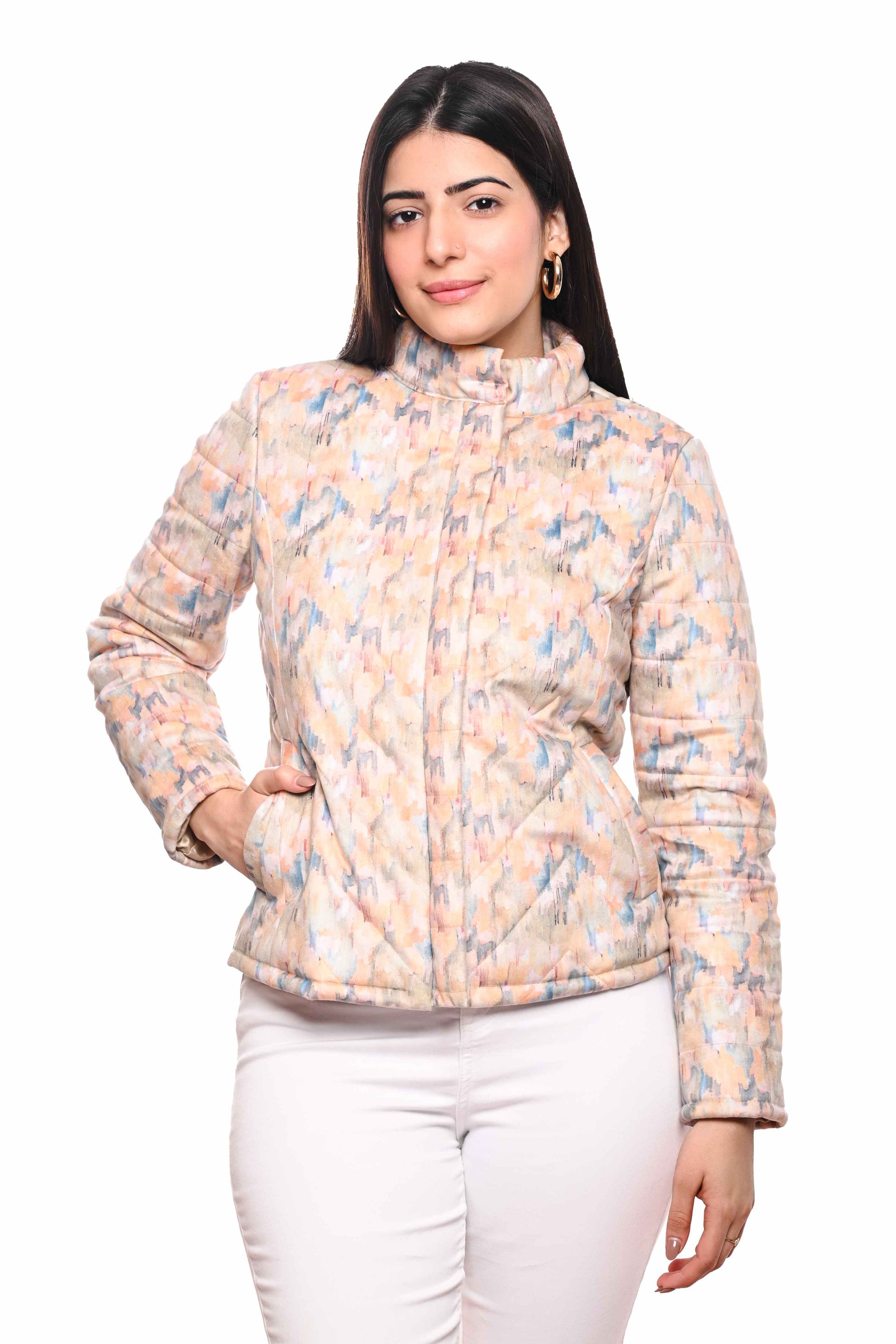 Puffer Jacket, Quilted with stand collar, Front Zip Closure, 2 Side pockets, Fulll Sleeves, Taffeta lining, Four layers which include outer shell, lining, interlining and polyfill wadding