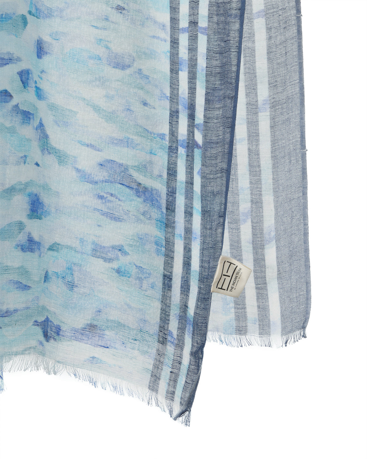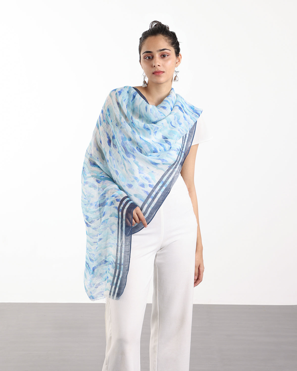 Ocean-inspired scarf with turquoise wave prints and dark blue borders to wrap you in calm.