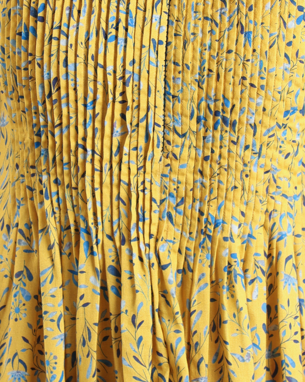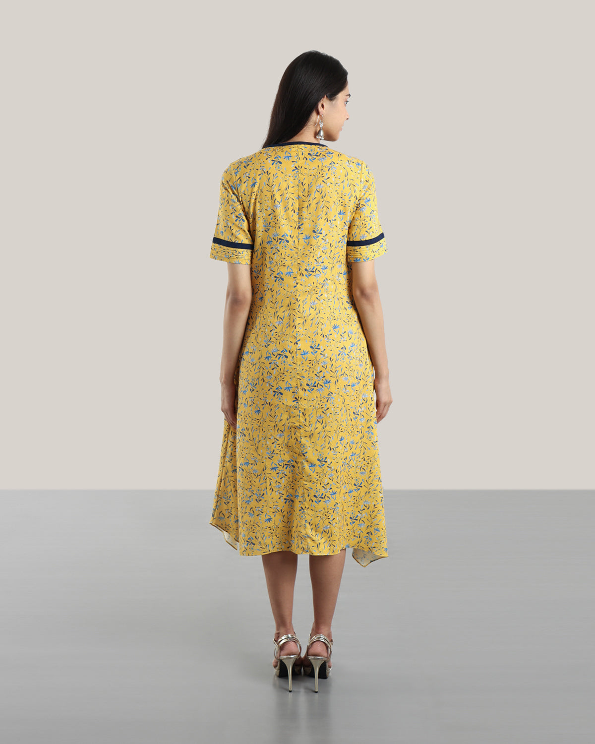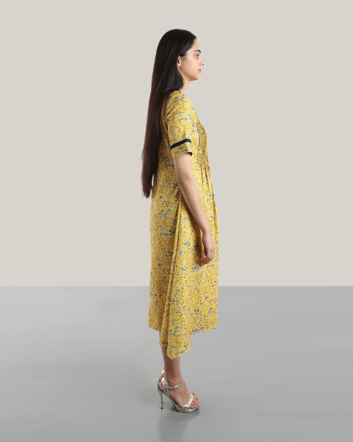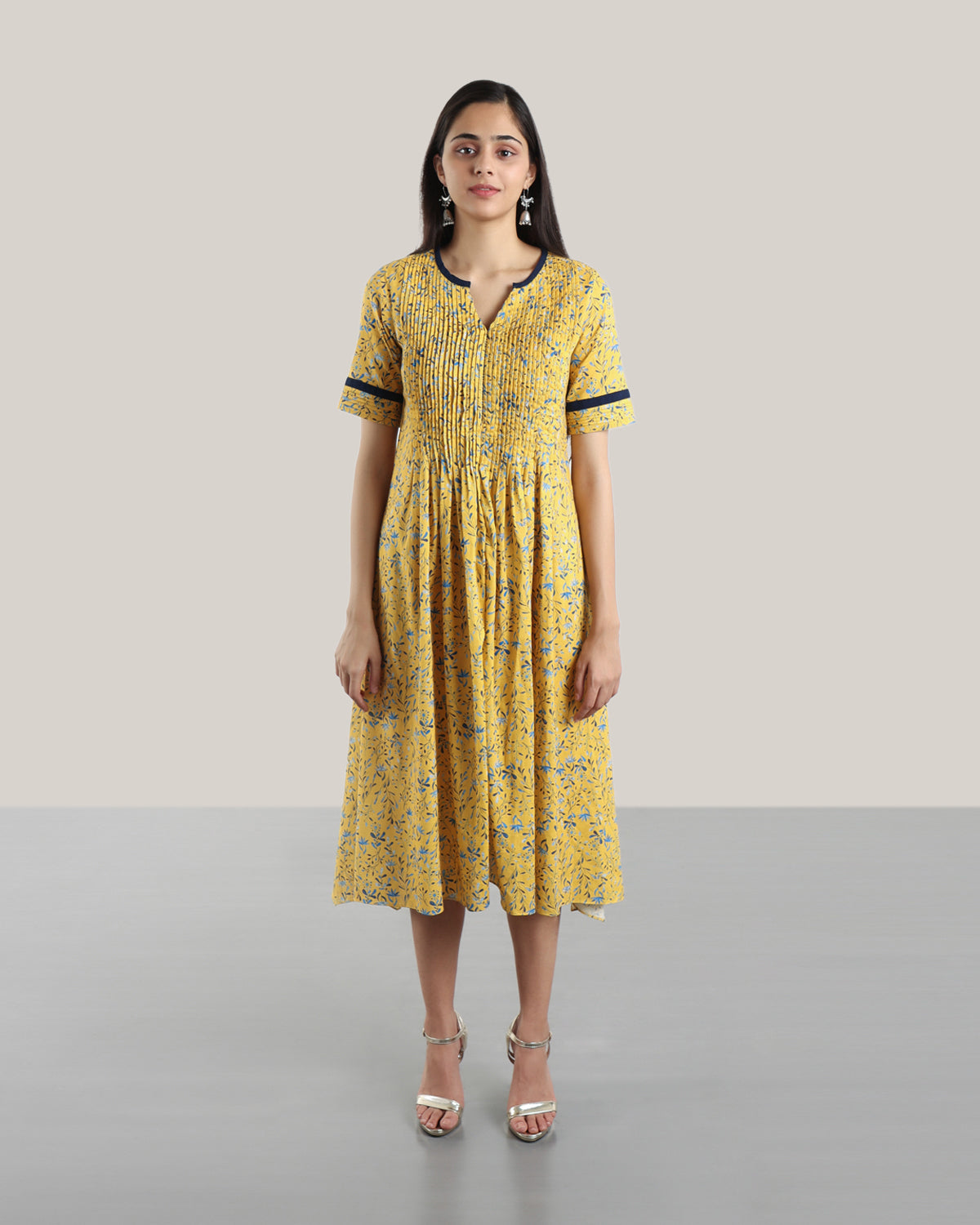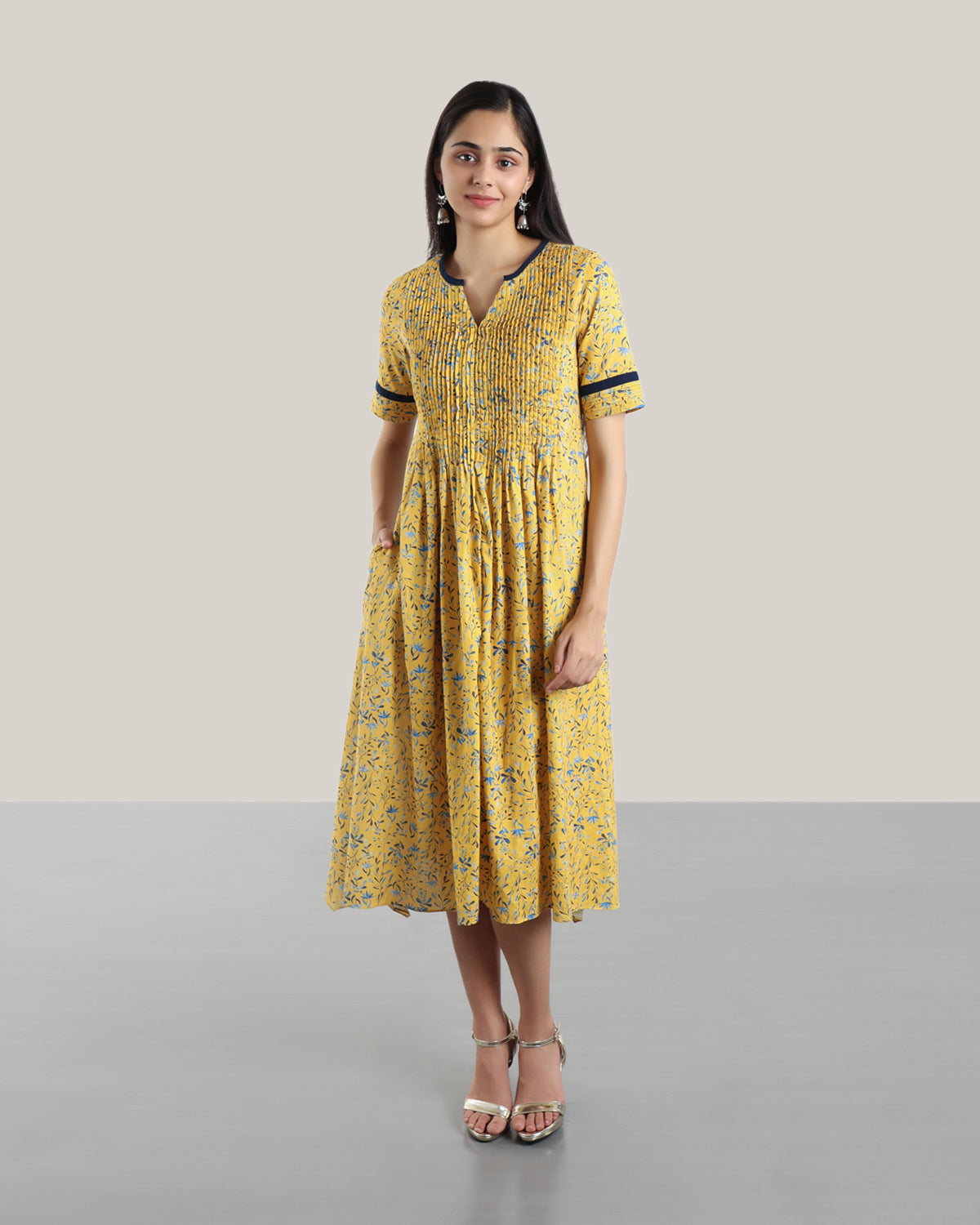 Round neck yellow disty folk dress with pleated cuff half sleeves and a gathered hem, beautified with floral print in Cotton Excel fabric for your day out in the city!